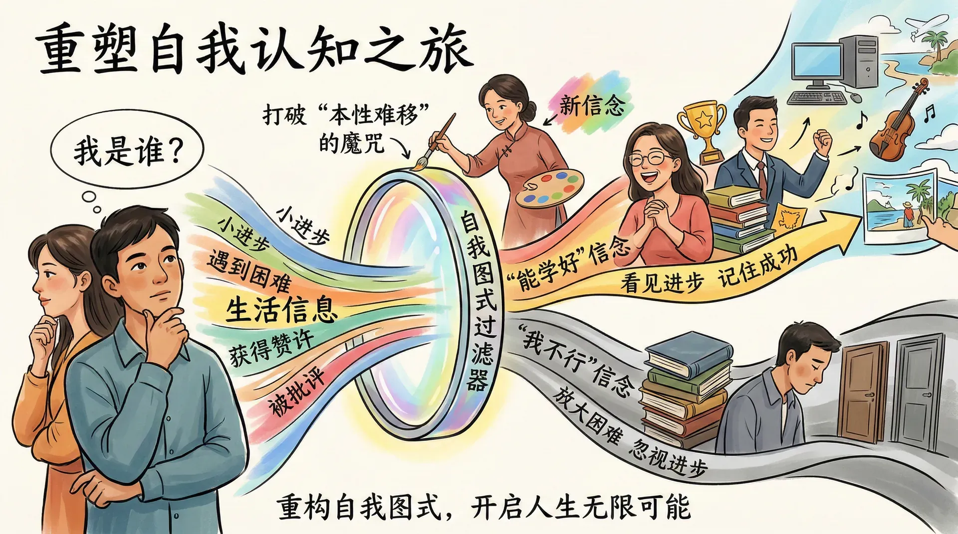 我们的自我概念很大程度上也建立在过往的成功和失败经历之上。每一次成功都会增强我们对某个领域的自信,每一次失败都可能让我们质疑自己的能力。关键在于如何解释这些经历。同样是考试失利,有人可能觉得“我就是不适合学这个”,有人可能想“这次准备不够充分,下次我会做得更好”。