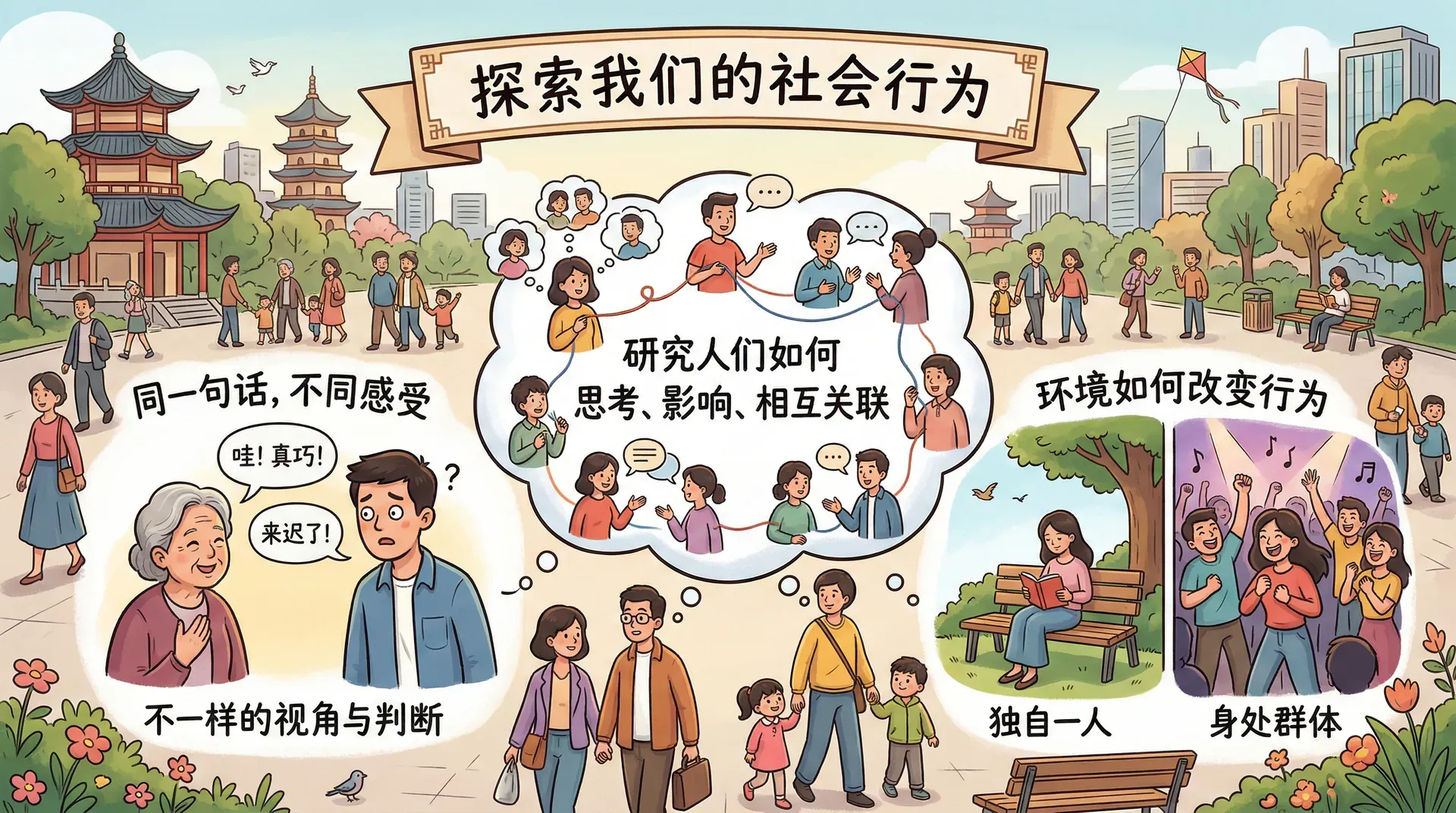 社会心理学是研究人们如何思考、影响和相互关联的科学。它特别关注我们所处的情境是如何影响我们看待自己、看待他人,以及做出各种判断与行为的。这门学科研究的问题往往不是遥远的哲学命题,而是我们每天都在经历的具体处境——为什么同一句话会让两个人产生截然不同的反应?为什么人在群体中的行为有时和独处时大相径庭?