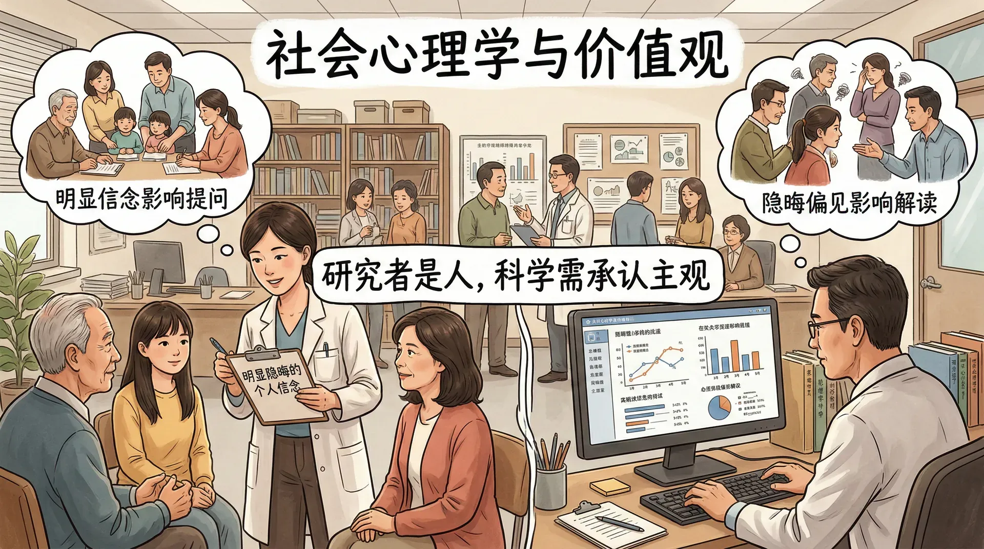 社会心理学家的价值观,以明显和隐晦的方式渗透到他们的工作中。研究者是人,他们关于什么是可取的、人们应该如何行为的个人信念,必然会在某种程度上影响他们如何提问、如何解读结果。这并不意味着社会心理学无法成为一门科学,但承认这一点,是严肃对待科学的必要前提。