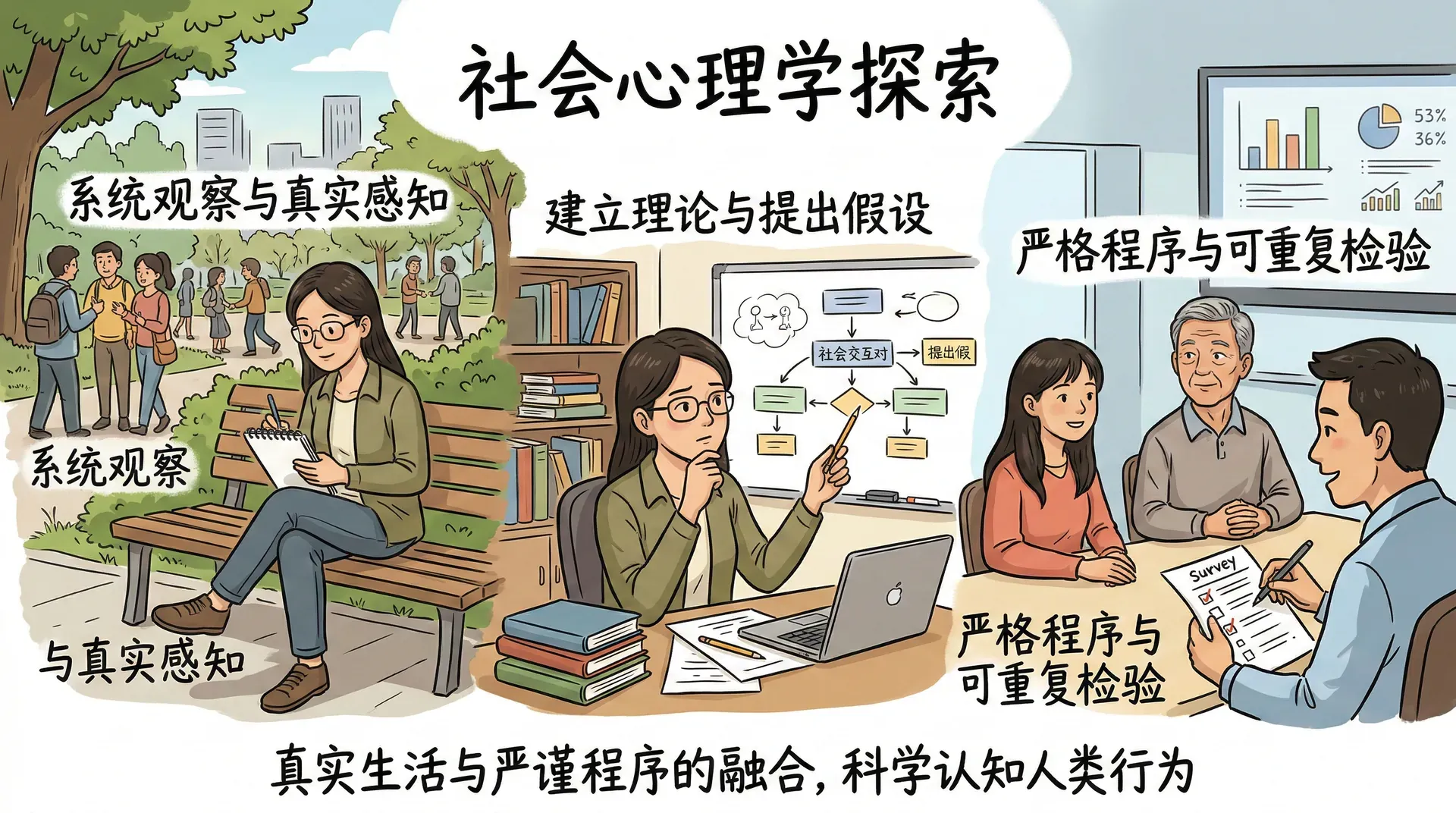 社会心理学的洞见不来自哲学沉思或文学直觉,而来自系统的观察与严格的研究程序。在对人类行为的追问中,社会心理学家建立理论、提出假设,并通过可重复的研究方式加以检验。这一过程需要想象力,也需要严谨性;需要对真实生活的敏感,也需要对方法论的自觉。