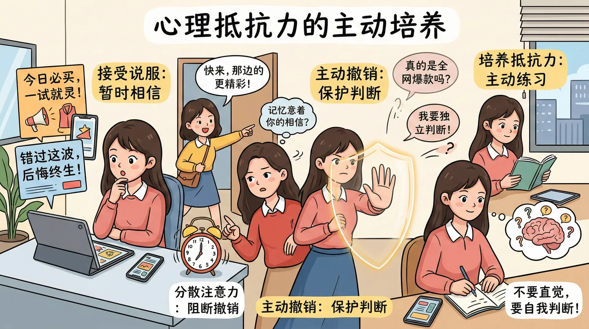 建立对说服的抵抗力,最有效的方式不是拒绝一切信息,而是主动接触不同观点并练习回应。这种主动参与比单纯强化既有信念更能产生持久的心理防御,也更能帮助人们在真实的社会压力面前保持清醒。