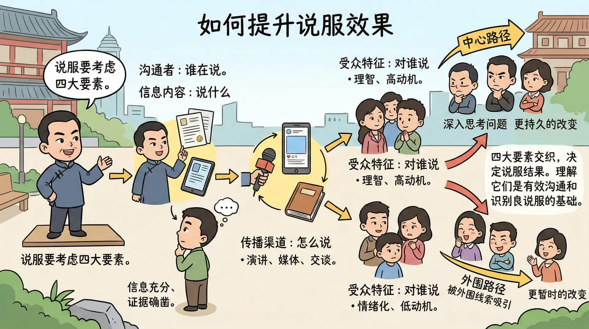 社会心理学家在研究说服时发现,决定说服效果的核心要素可以归纳为四个方面:谁在说、说什么、怎么说、对谁说——也就是沟通者、信息内容、传播渠道和受众特征。这四个要素相互交织,共同决定了一次说服能够产生多大的影响,以及这种影响走的是中心路径还是外围路径。理解这四个要素,既是成为有效沟通者的前提,也是识别和抵抗不良说服的基础。