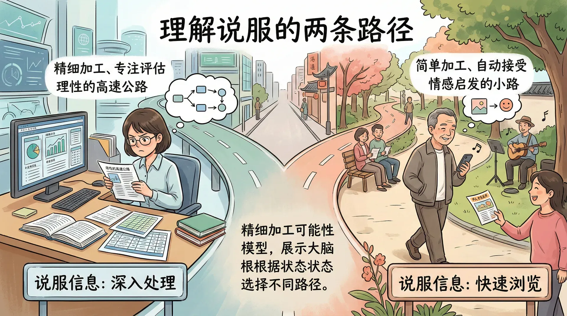 心理学家理查德·佩蒂和约翰·卡西奥波在二十世纪八十年代提出了“精细加工可能性模型”,认为人们接受说服信息的方式主要有两种截然不同的路径。就像城市中既有需要专注驾驶的高速公路,也有不假思索就能走完的熟悉小路,我们的大脑在处理说服性信息时也会根据当下的状态选择不同的“道路”。这一模型不仅是理解说服效果差异的关键,也是当代“双重加工”认知理论的重要奠基之作。
