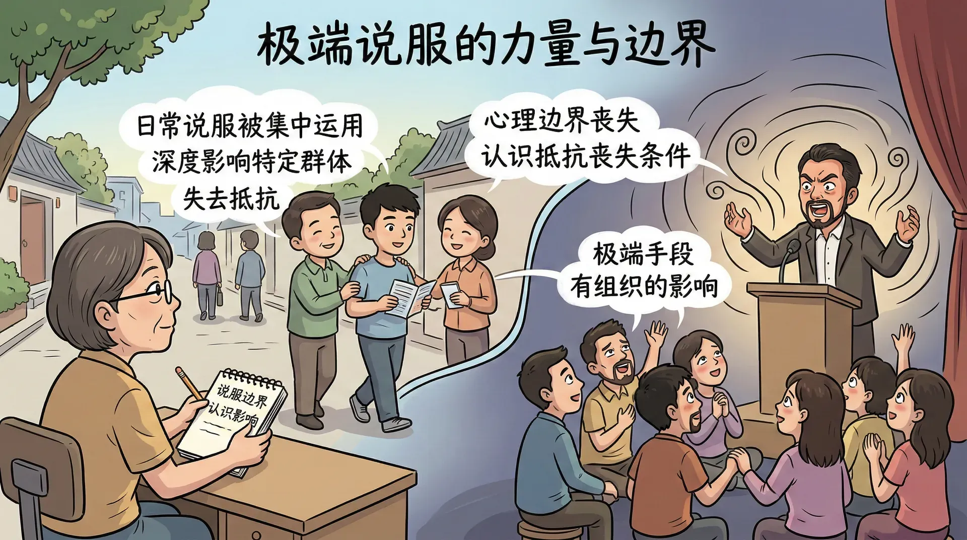 说服技巧在日常生活中广泛存在,但当这些技巧被有组织地、极端地运用时,就可能产生令人震惊的后果。邪教的存在是研究极端说服的重要窗口——它们将所有已知的说服要素集中运用,在有限的时间内对特定群体实施深度影响。研究邪教的心理机制,并非为了猎奇,而是为了认识说服力量的边界,以及普通人在什么条件下会对极端影响失去抵抗。