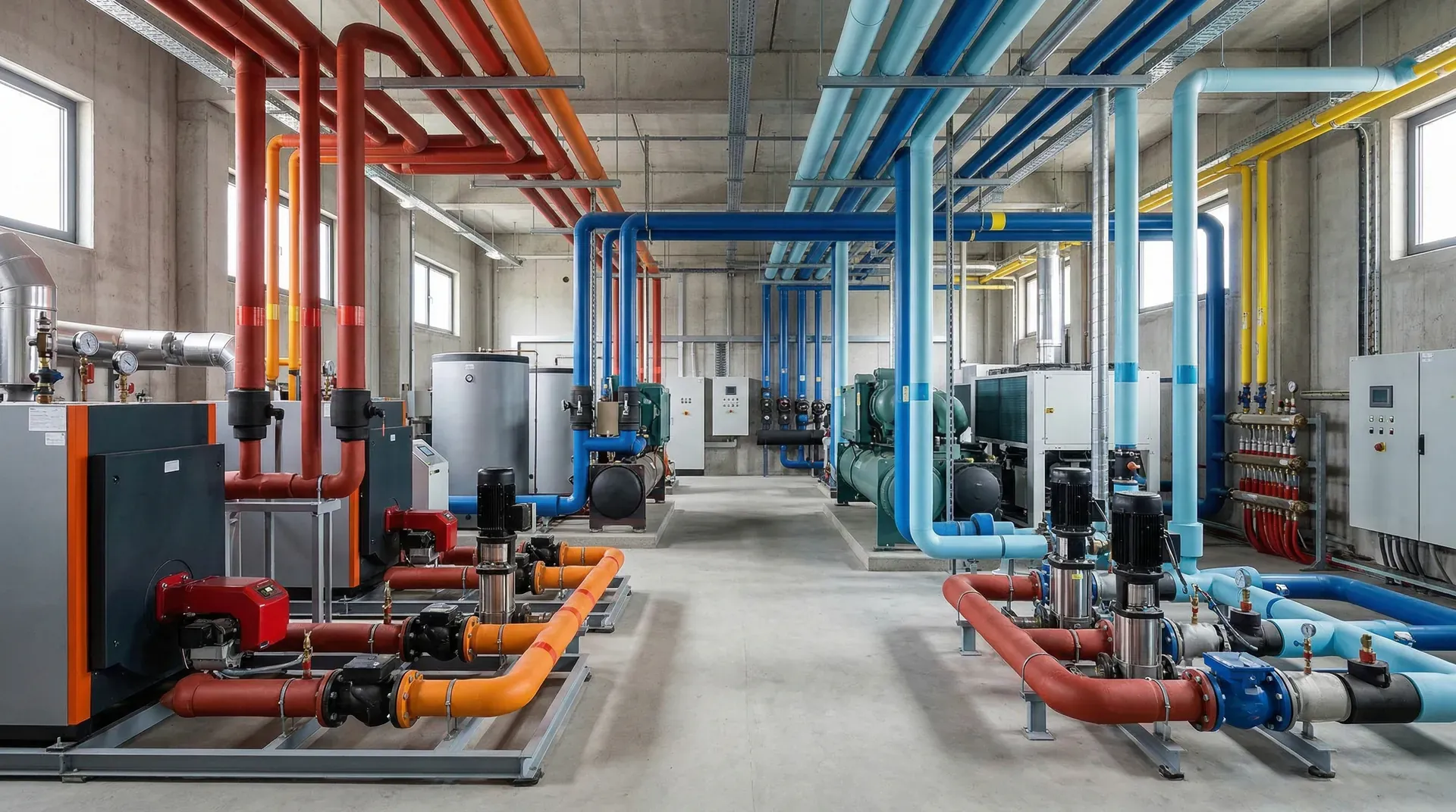 锅炉房(供暖):北方的建筑还需要锅炉房提供热水用于冬季供暖。现代建筑里,锅炉房和冷水机组房经常合并设置在同一个区域,因为它们需要相似的配套条件,比如都需要大型水泵、良好的通风空间。