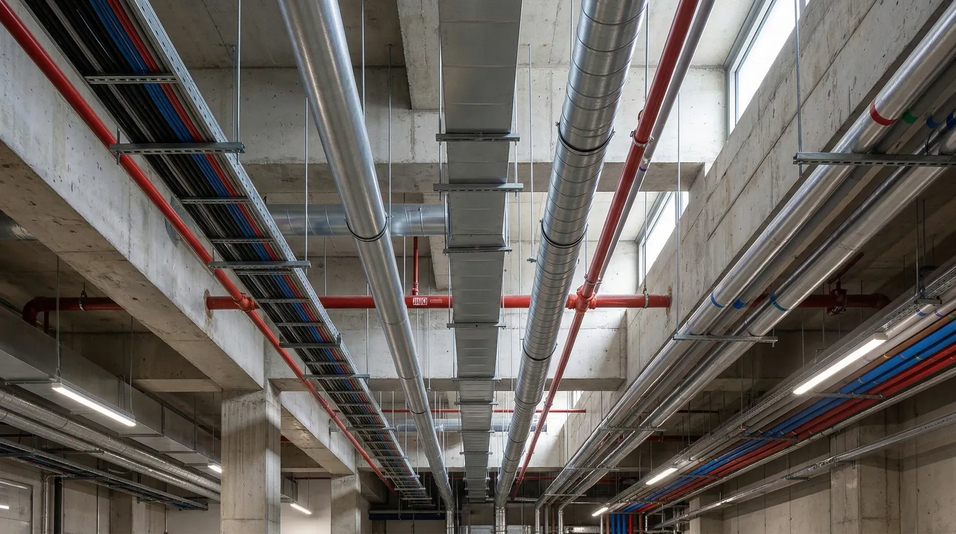 成都某甲级写字楼在设计时把风管的走向与结构梁的方向统一考虑。主风管平行于主梁走,支风管垂直于主梁。这样风管大部分时间都在梁间穿行,最大限度节省了设备层高度,让层高从原本需要的4.8米降到了4.5米。整栋30层的楼省下了9米高度,相当于省了2层楼。