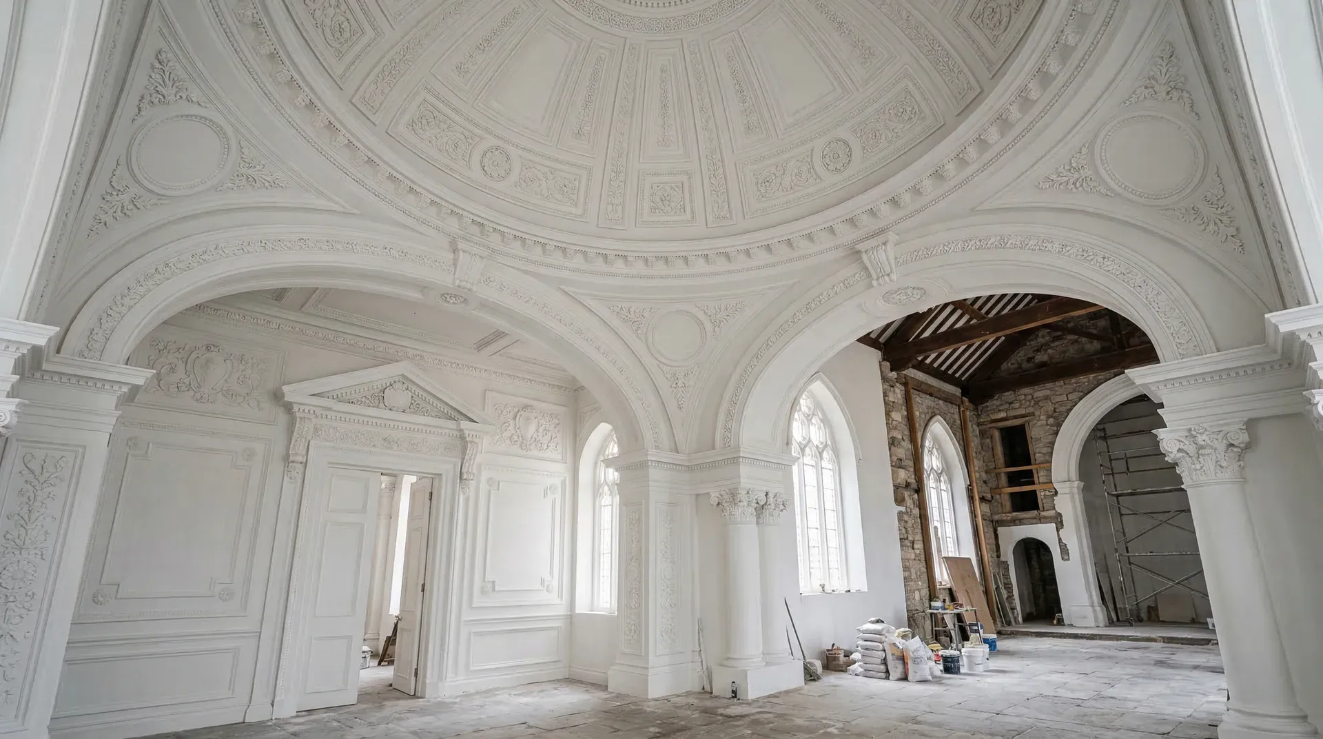 装饰用石膏制品(如石膏线条、浮雕、造型件等)依托石膏细腻洁白和可塑性强等特性,可制作出复杂、精美的艺术造型,在欧式或古典风格室内装饰中应用广泛,例如用于顶角线、灯盘、柱头等部位。