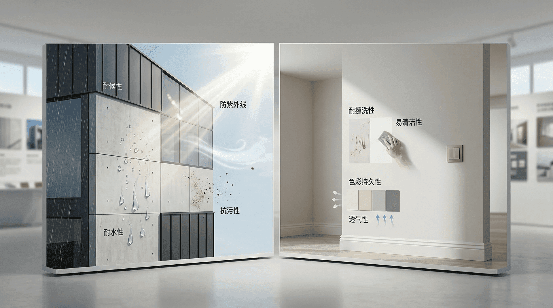 由于所处环境截然不同,外墙涂料和内墙涂料的性能要求存在本质区别。外墙涂料需应对风吹日晒、雨水、温度变化和空气污染等恶劣条件,因此要求极高的耐候性、耐水性和抗污染性;而内墙涂料主要承载装饰与环保责任,强调空气安全、色彩丰富与便于清洁。
