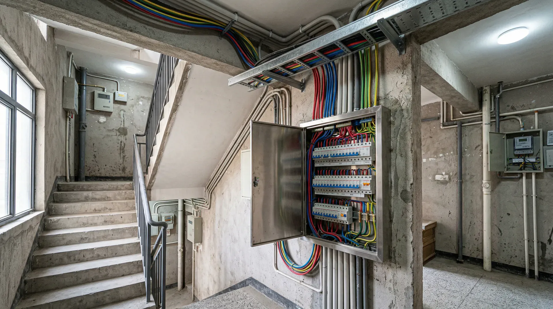 住宅建筑的供电系统结构较为简洁,多采用单相三线制方式供电。一般情况下,电缆自小区变电站引入后,先分配至楼栋内的配电箱,再通过楼层配电箱逐层分送,最终连接到每户专用的户内配电箱。通过这样的分级配电设计,可以有效实现分区管理和故障隔离,保证个别住户用电出现异常时不会影响其他住户的正常用电。