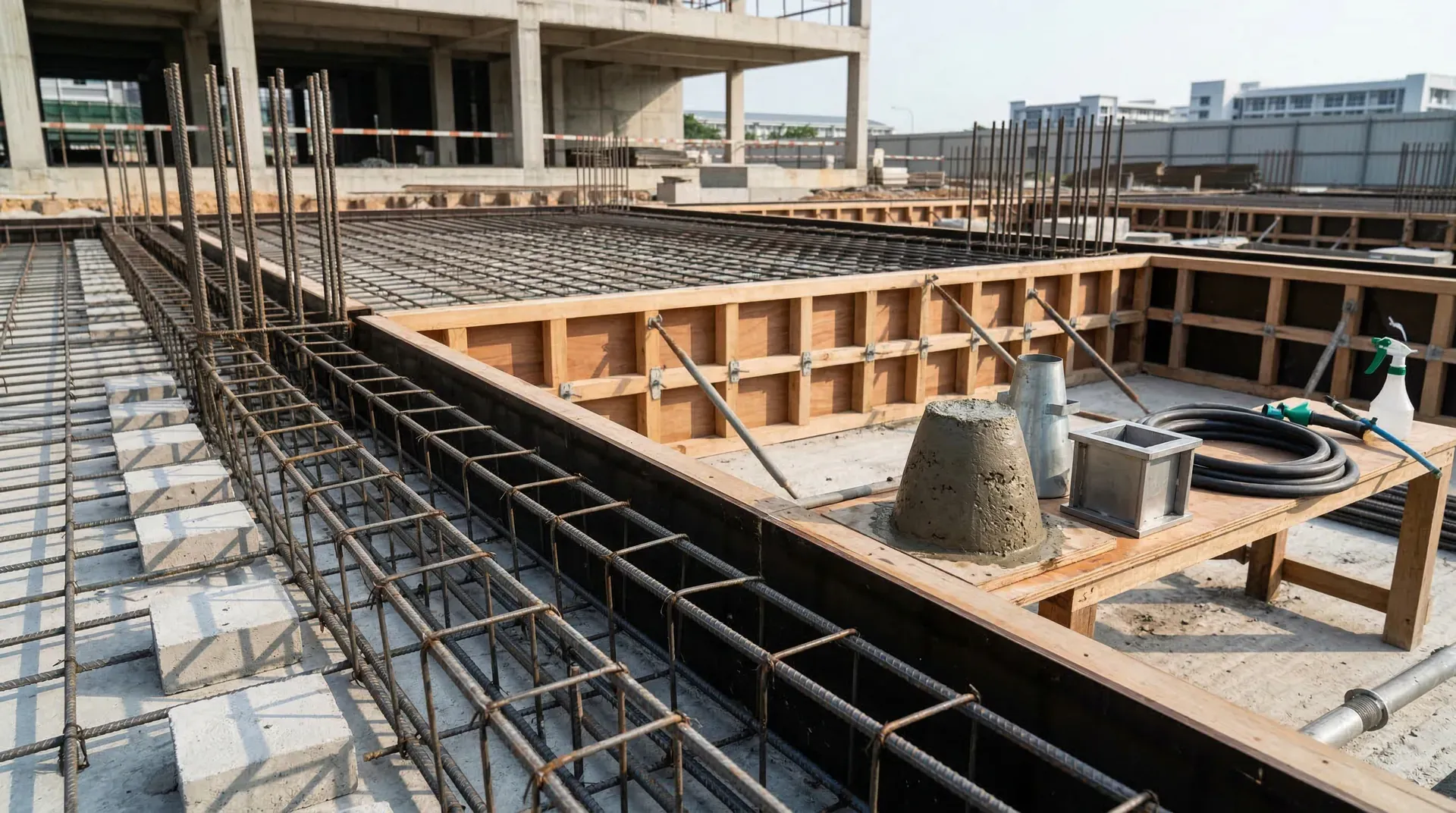 保护层控制依靠塑料垫块、钢筋马凳定位。保护层过薄导致钢筋锈蚀风险增大,过厚则影响结构有效高度和承载力,均需严格按图纸与规范布设。