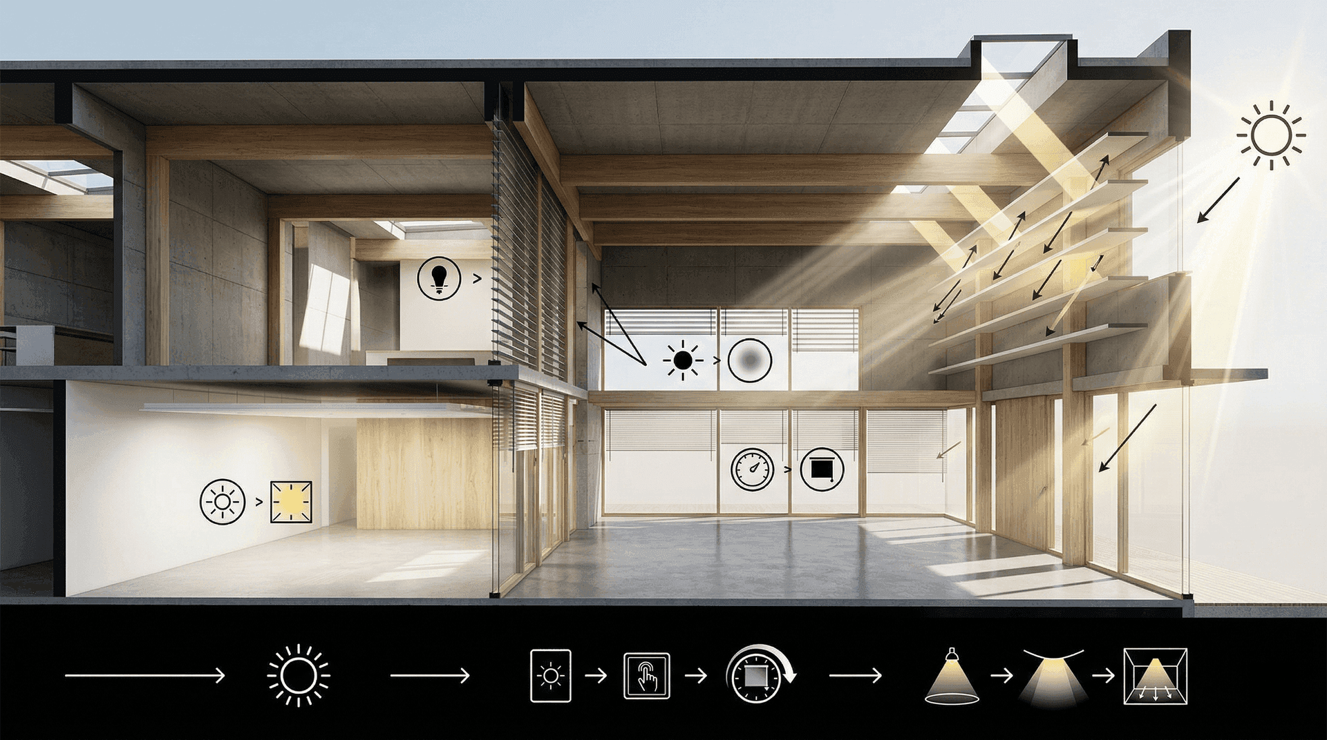 建筑光环境主要由两部分共同构成:一是来源于室外的天然光(采光),如日光和天空光;二是人为创造的人工光(照明),比如各种灯具。两者在一天中的不同时段、不同天气和使用场景下,常常相互补充协作,共同营造出适宜的建筑内部光照条件。成功的建筑光环境设计,通常需要结合空间功能、用户需求和自然条件,科学协调采光与照明的比例与质量,使人们在任何时刻都能获得健康、舒适、节能的光环境。