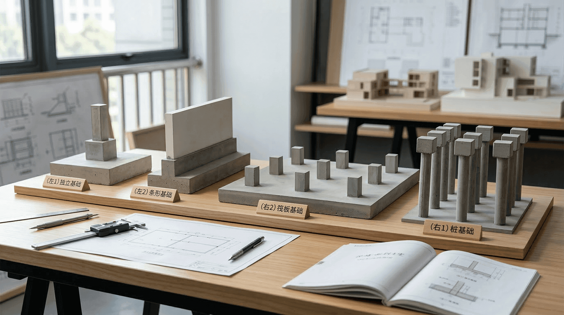 基础形式依建筑受力与地基状况分为浅基础和深基础。常见浅基础有独立基础、条形基础、筏板基础;深基础以桩基础为主,不同类型基础有不同优缺点,应针对工程实际合理选型。