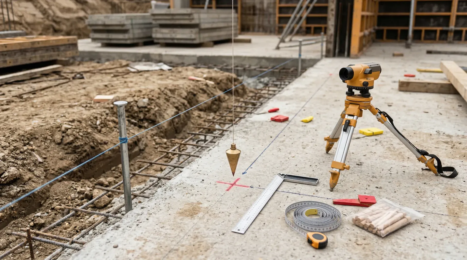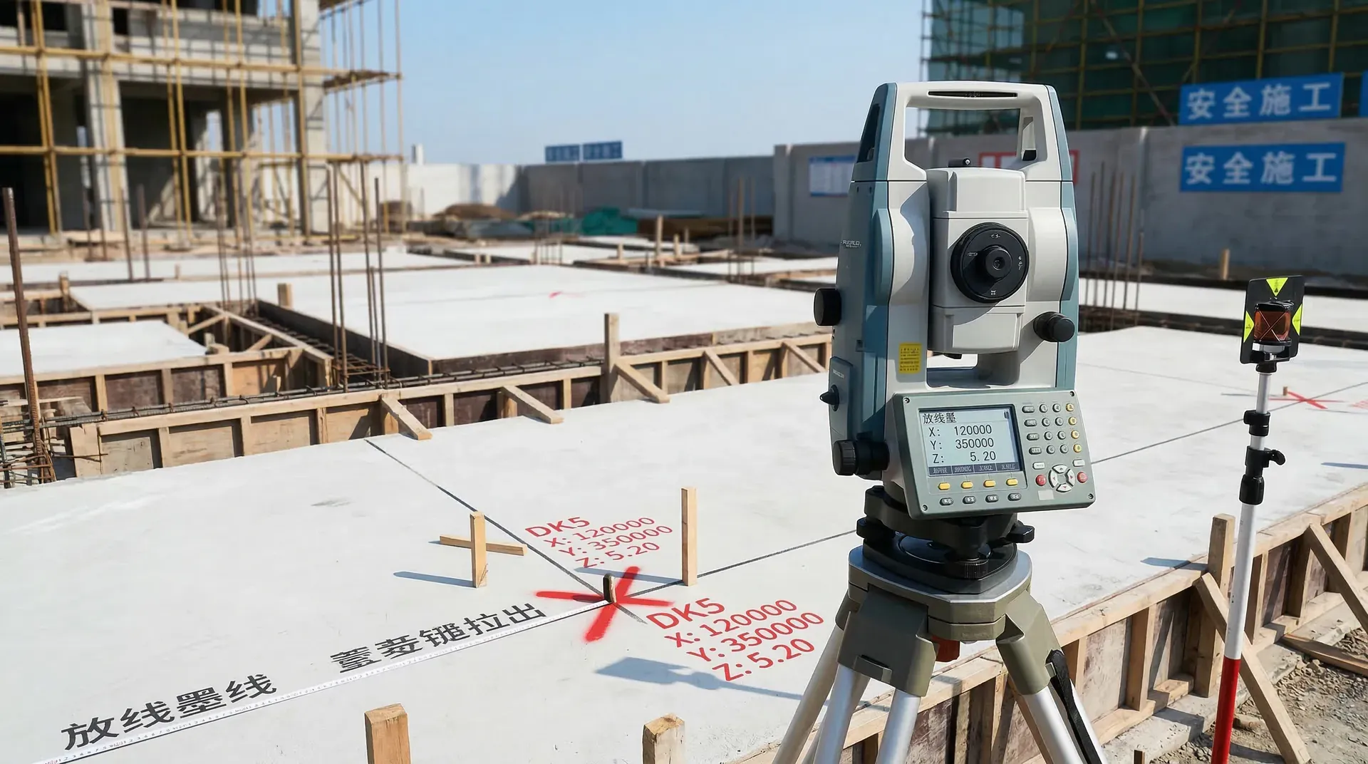 建筑物定位基于总平面图,与红线、道路中心线或永久性建筑物形成精确关系。放线前需建立控制网络,采用方格网或导线网,在隐蔽处设置永久标志点。