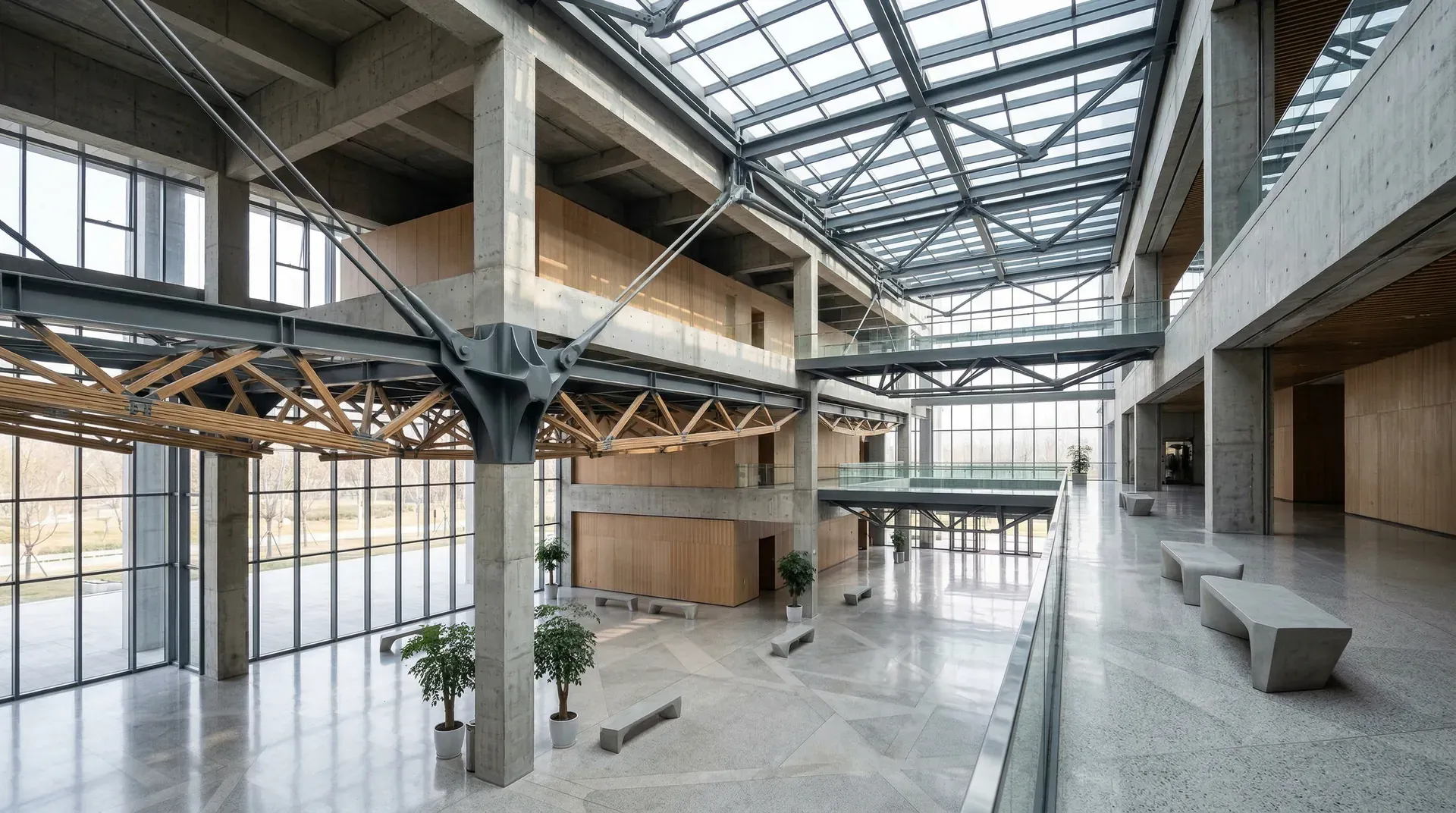 某博物馆的设计中,主展厅需要20米×30米的无柱空间,设计团队采用了钢桁架结构。桁架的高度为3米,隐藏在天花吊顶之上,展厅内部完全看不到结构构件。顶部开设天窗,自然光通过漫射进入展厅,营造了柔和的光环境。