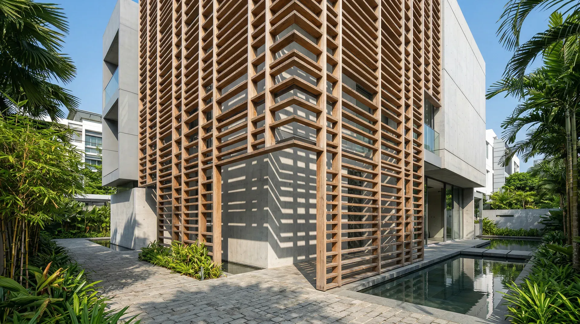 悬挑结构常用于遮阳设计,如外挑楼板或构件可为室内和下层区域带来有效的阴影,减少太阳直射热量。以南向建筑为例,建议挑板宽度在1.2至1.8米,可以显著阻挡强阳光、降低室内温度。但挑板过长会增加结构难度和施工成本,应综合考虑遮阳效益与结构可行性,找到合理平衡点。