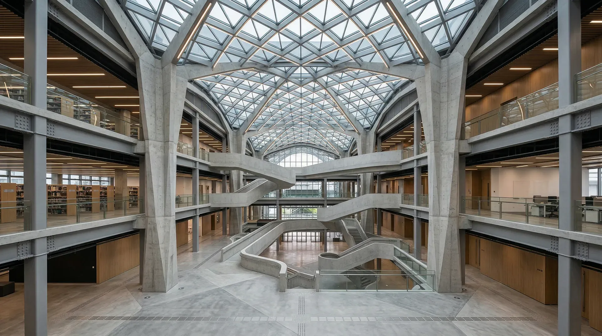 图书馆书库:密集书架带来巨大楼板荷载,常是普通空间的数倍。结构上采用井字梁楼盖(主梁与次梁正交布置),合理提升梁高(如600mm),控制跨距和楼层高度平衡,既保证承载又不影响空间利用。
