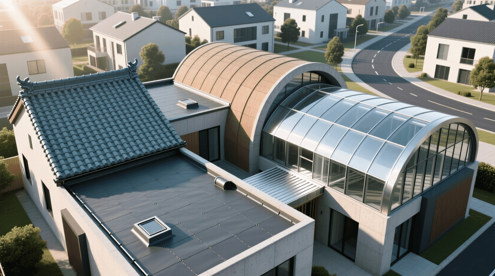 现代城市建筑中,平屋顶越来越普遍。平屋顶便于在屋顶设置设备(如空调外机、水箱)、活动平台甚至屋顶花园。许多高层住宅的顶层带有屋顶露台,就是利用了平屋顶的空间价值。当然,平屋顶的防水要求更高,需要铺设专门的防水卷材,并做好排水坡度。