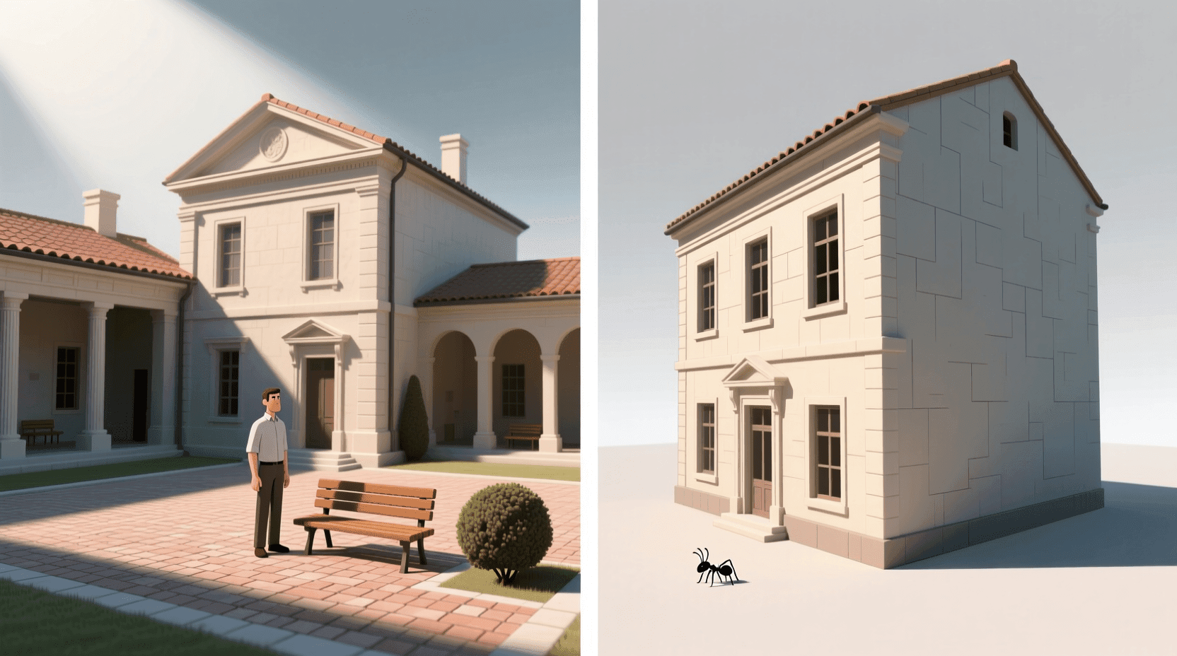 建筑尺度的核心在于参照系统。我们通过将建筑与已知尺寸的物体进行对比,从而判断建筑的实际大小和给人的感受。人体、门窗、台阶这些日常接触的元素,构成了我们判断尺度的基准。