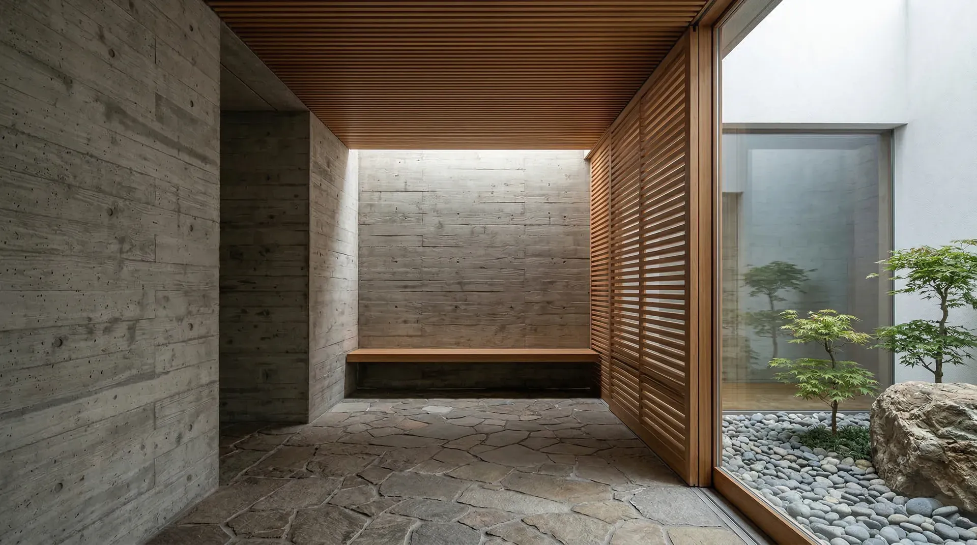 人对材料的感知是多维的:视觉、触觉、听觉和嗅觉共同作用。木材温润亲切,石材冷峻庄重,金属光泽精致而现代,混凝土的粗粝带来力量与真实性。这些特性在各种空间中决定了整体氛围。如日本建筑师安藤忠雄的清水混凝土,其光滑表面、灰色调和明暗变化共同营造出宁静沉思的空间,超越了单一物质的功能。而中国传统对木材的运用,则通过自然纹理和色调营造出温馨、自然的居住环境,尤其在寺庙等场所,木材大量使用更有助于形成安详氛围。