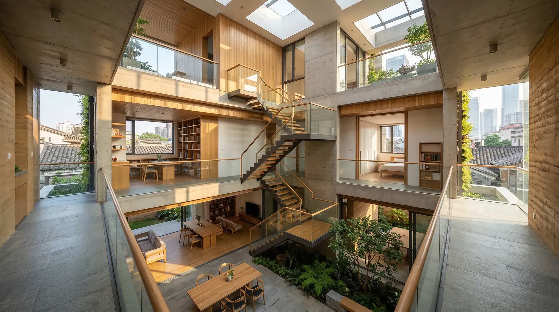 教育建筑: 传统教学楼以“单走廊+教室”串联布局为主,其优点是高利用但空间单调。近年来,组团式布局兴起,如北京某小学,将4-6间教室组成教学单元,并配置共享活动空间与办公区,多个单元环绕中央庭院。这样既满足分班教学,也促进年级组交流与自然采光通风。