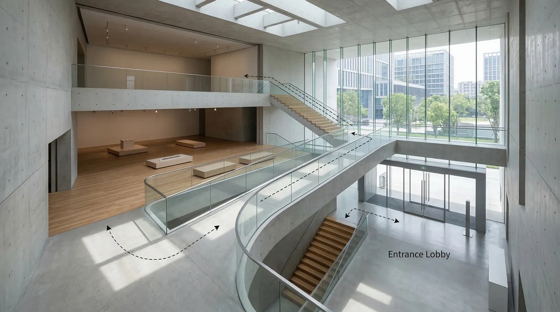 商业和文化建筑的流线设计不仅要考虑顾客与访客的空间体验、视觉导向和场所氛围,还要满足运营管理、品牌展示与人群分流等实际需求。例如,商场常通过“之”字形扶梯、核心动线穿越主力商品区等布局,提升停留时长和商业价值;美术馆、博物馆等文化空间则强调参观流线的连贯性与层次感,提升观展体验与参与互动。