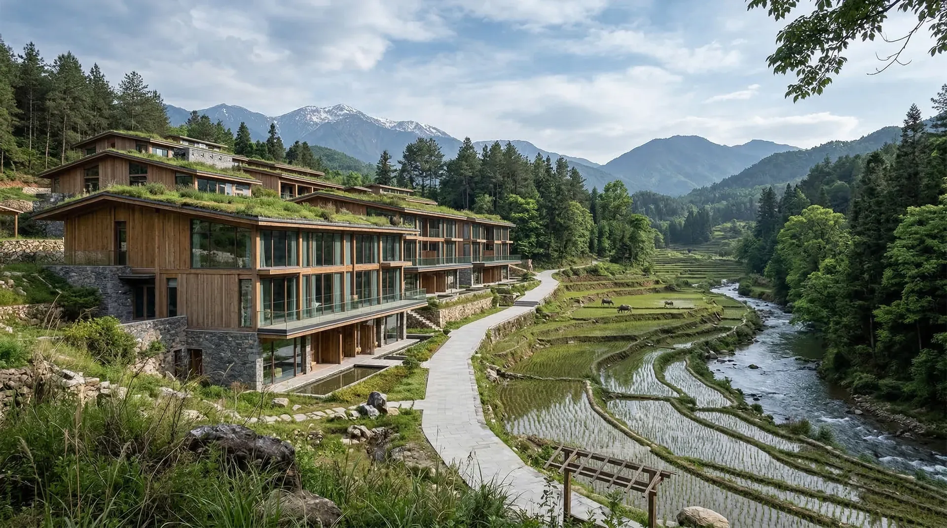 山地建筑设计的核心原则是“顺应地形、最小干预”。建筑应当像生长在山上的植物一样,与地形、地貌、生态环境和谐共生。