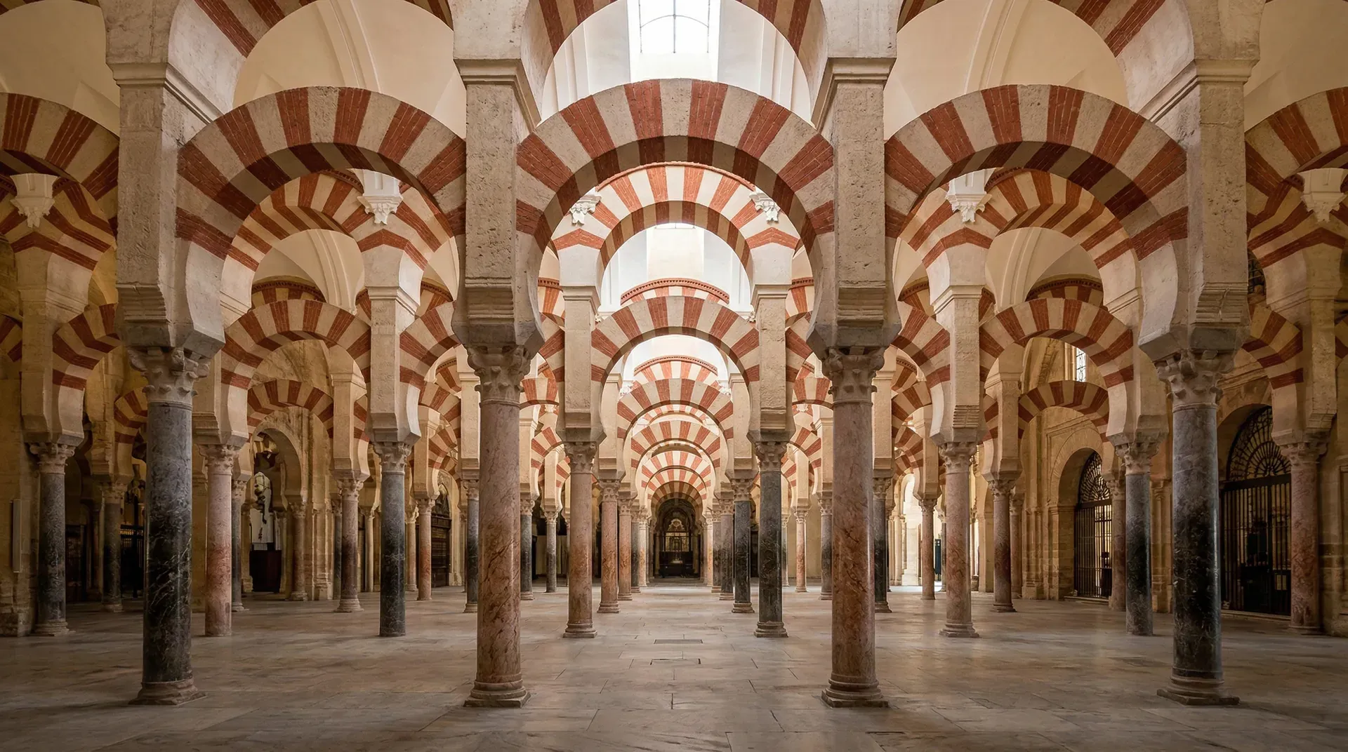 科尔多瓦大清真寺建于公元785年,历经几代苏丹扩建,最终成为占地约148,500平方米的宏伟建筑,仅次于梵蒂冈圣彼得大教堂。其最显著的空间特征,便是内部的“红白双层拱廊”: