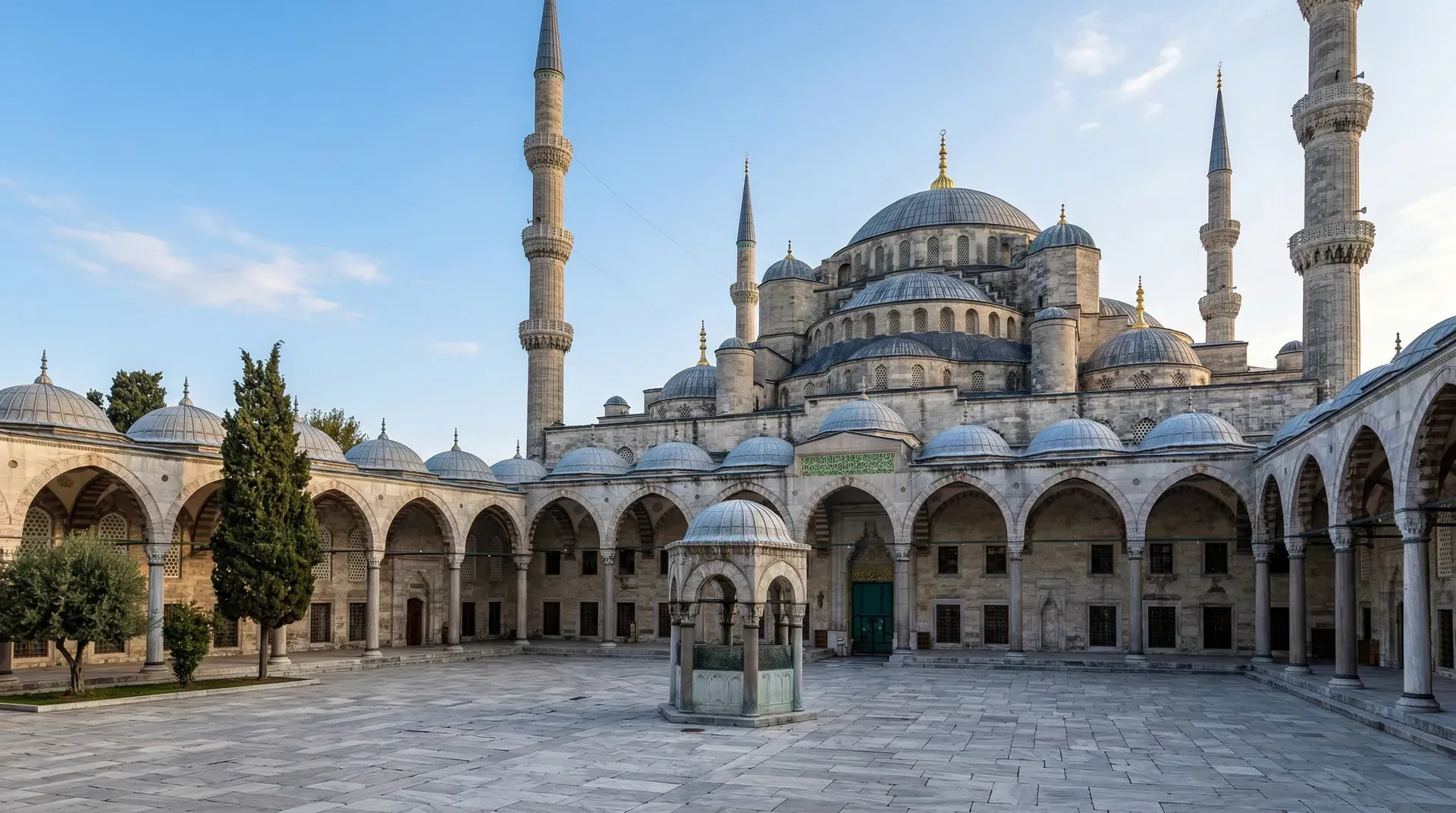奥斯曼清真寺普遍采用以中央巨型穹顶为核心、四周辅以半穹顶与小穹顶的集中式布局,这种设计直接借鉴自圣索非亚,并加以简化和标准化。以苏莱曼清真寺(1558年,建筑师希南)为例,主穹顶直径27.5米、高53米,四角矗立高达76米的宣礼塔,整体结构依靠四大扶壁和环绕的小穹顶完成重量分布,轮廓简洁有力。