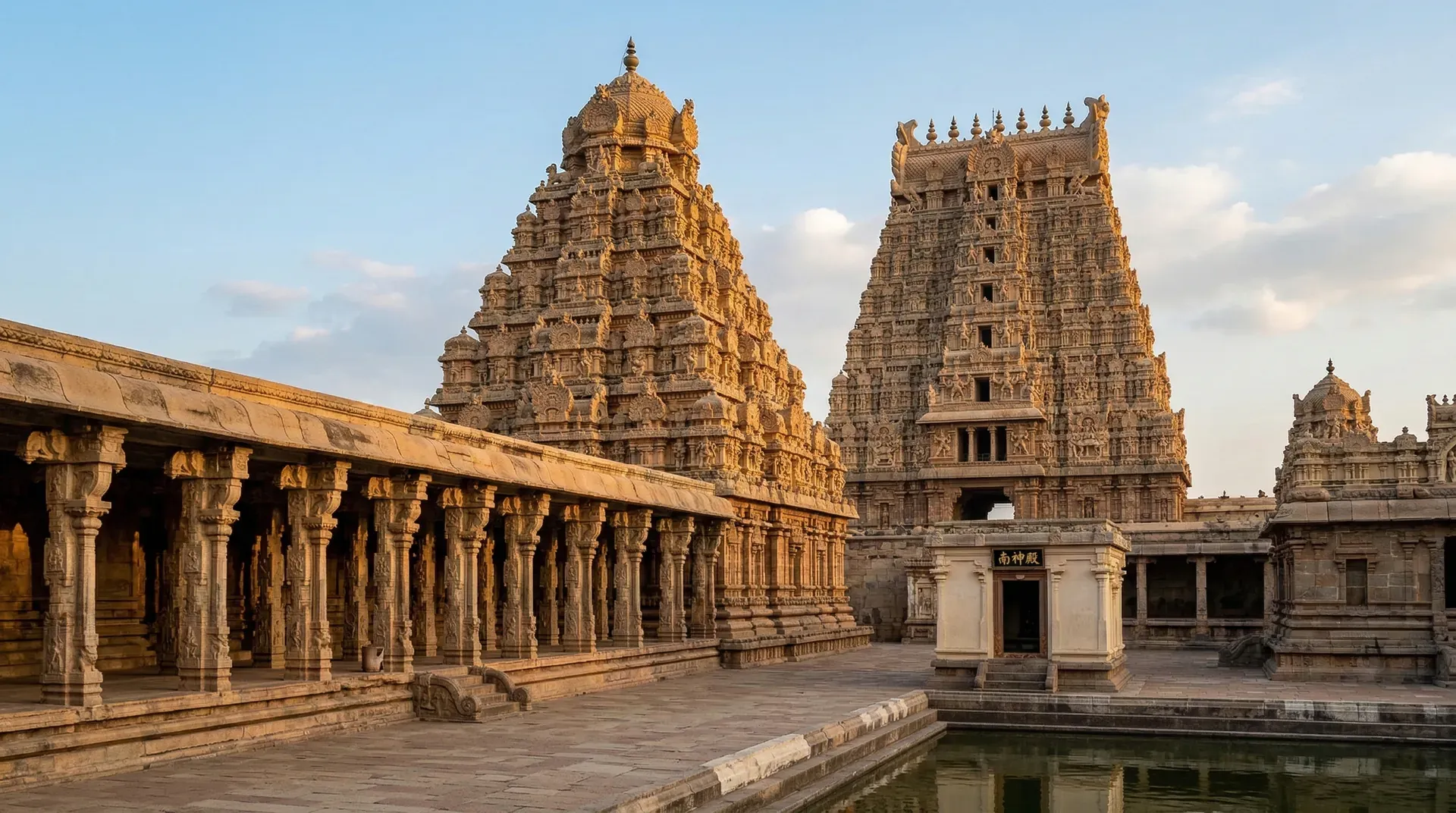 Choultry(列柱厅) 功能多样,可作前廊、仪式大厅、休息空间或次要神祇的供奉地。奇丹巴拉姆寺的列柱厅拥有近千根雕刻柱子,排列成迷宫般的五排,风格统一而各具变化,营造出神圣而神秘的空间体验。