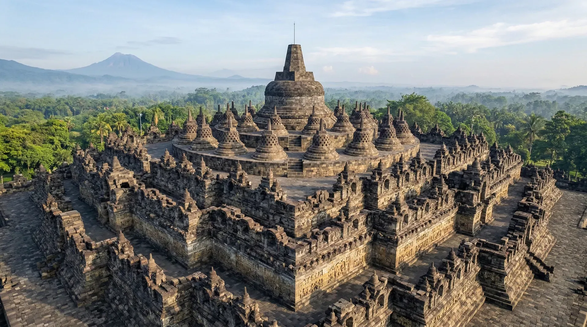 婆罗浮屠(建于公元8世纪)以坛城式金字塔结构著称,是印度建筑风格与东南亚本土融合的代表性遗产: