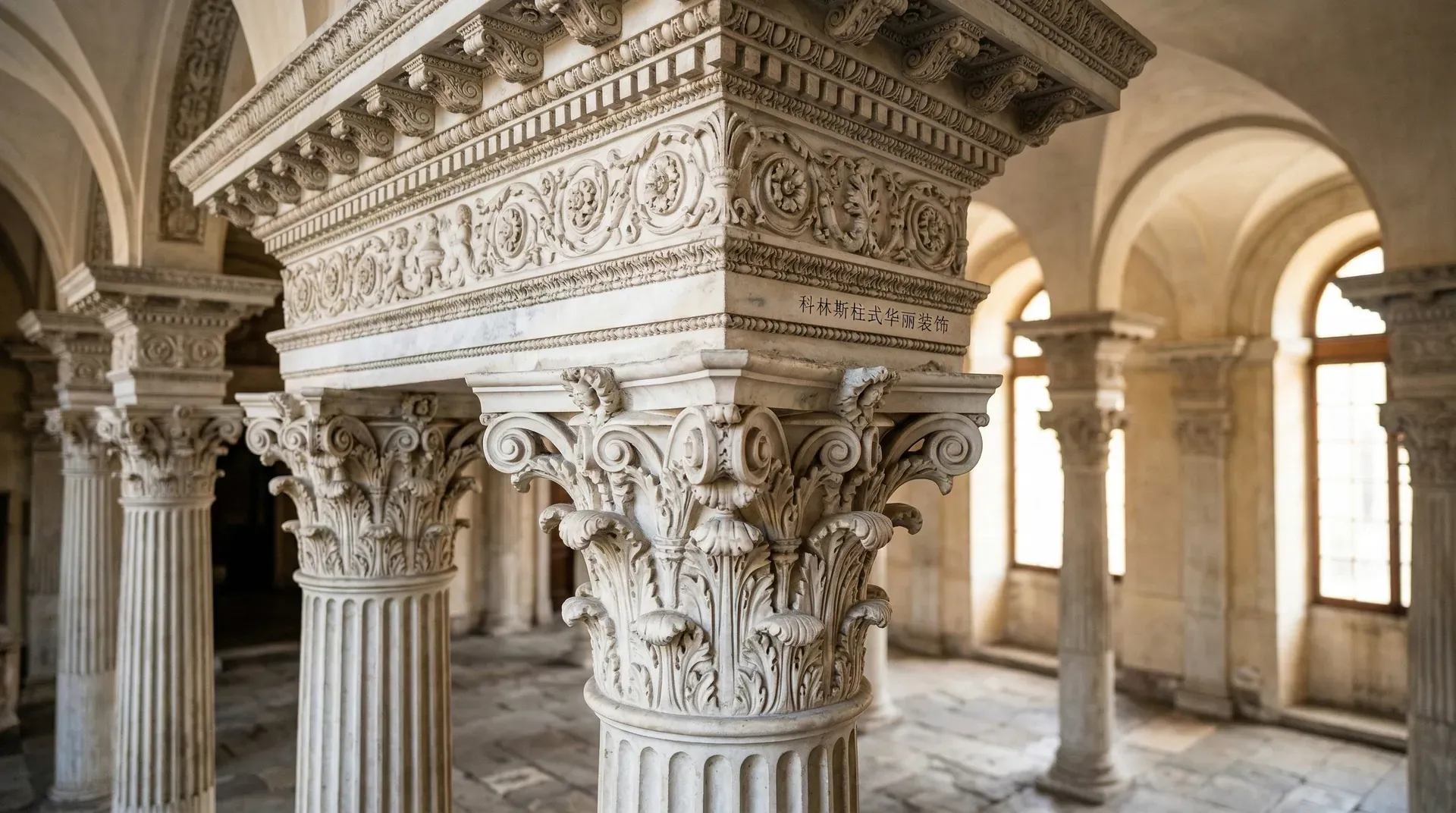 科林斯柱式出现得最晚,是在前两种柱式的基础上发展出来的。它保留了爱奥尼柱式的纤细比例和柱础,但在柱头的设计上做出了大胆的创新:用繁复的植物装饰替代了简洁的涡卷。
