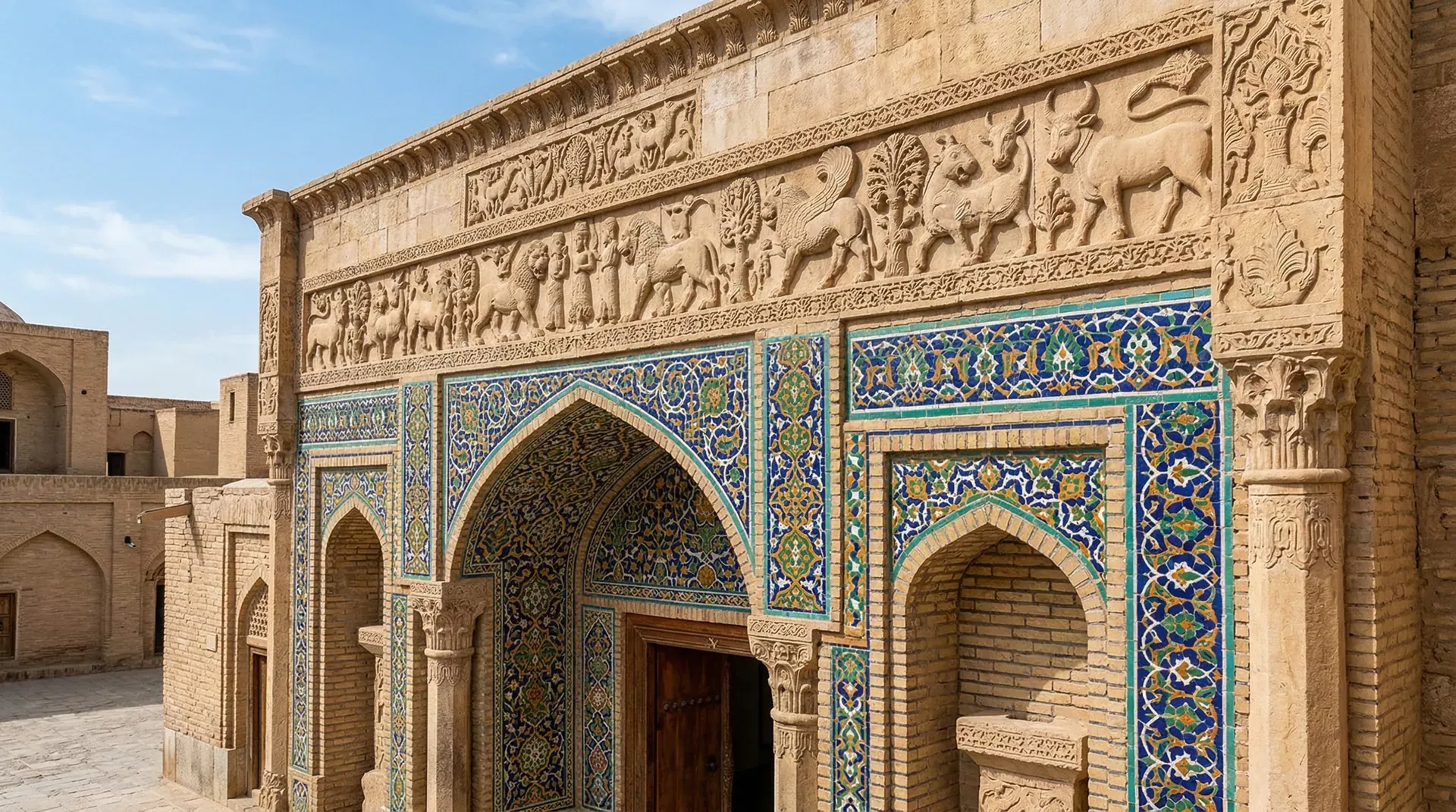 浮雕上方的墙面则涂绘彩色图案或镶嵌釉砖。釉砖是西亚建筑装饰的独特创造。工匠在成型的砖坯表面涂上含有矿物质的釉料,经高温烧制后形成光亮的玻璃质表面。不同的矿物质产生不同的颜色,蓝色、绿色、黄色、白色、黑色的釉砖组合出复杂的图案。