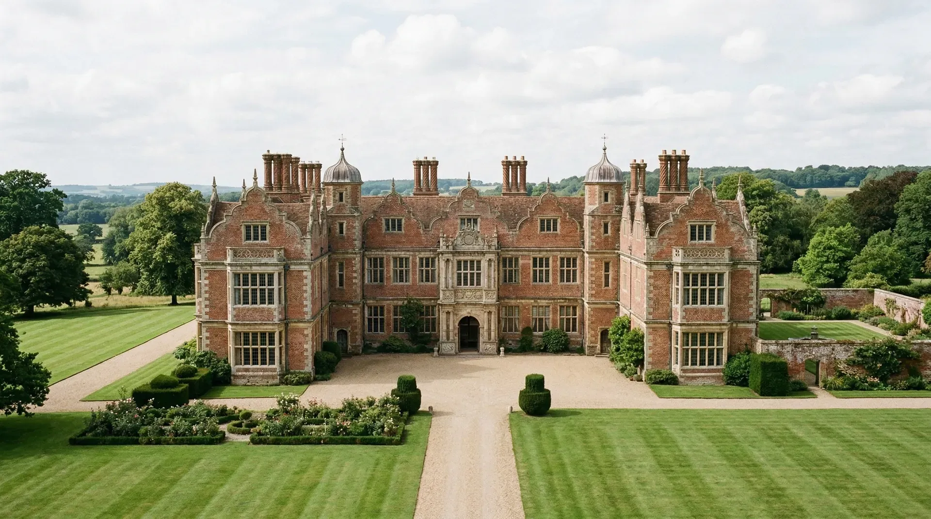 16世纪中后期的英国,建筑开始从防御性的城堡向舒适的居所转型。这个时期的贵族庄园呈现出独特的面貌:红砖砌成的外墙上布满了大面积的窗户,窗框被竖向的石柱分割成规整的小格,菱形玻璃在阳光下闪烁。建筑顶部排列着一系列山墙,装饰着球形和尖顶构件。