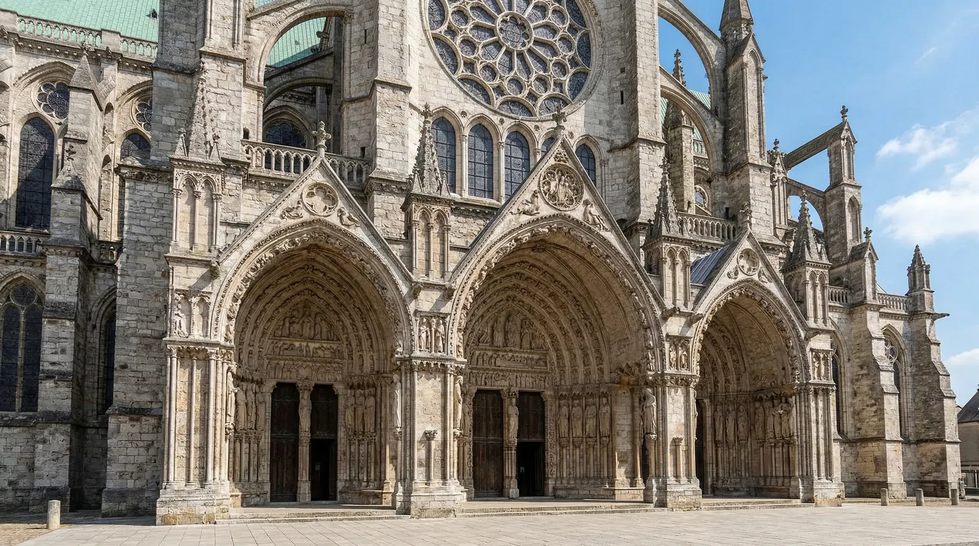 法国哥特式建筑强调垂直高度和“直指苍穹”的精神内涵。最具代表性的特征包括密集且高耸的飞扶壁,高挑的尖塔和细长的柱子,令整座教堂呈现向上的张力。比如亚眠、兰斯、沙特尔等大教堂,空间宏伟、光线充沛,放射状玫瑰窗成为不可忽视的视觉中心。这种设计让建筑内外都具有非凡的戏剧性和纪念意义,仿佛邀请人们超越尘世、接近天堂。