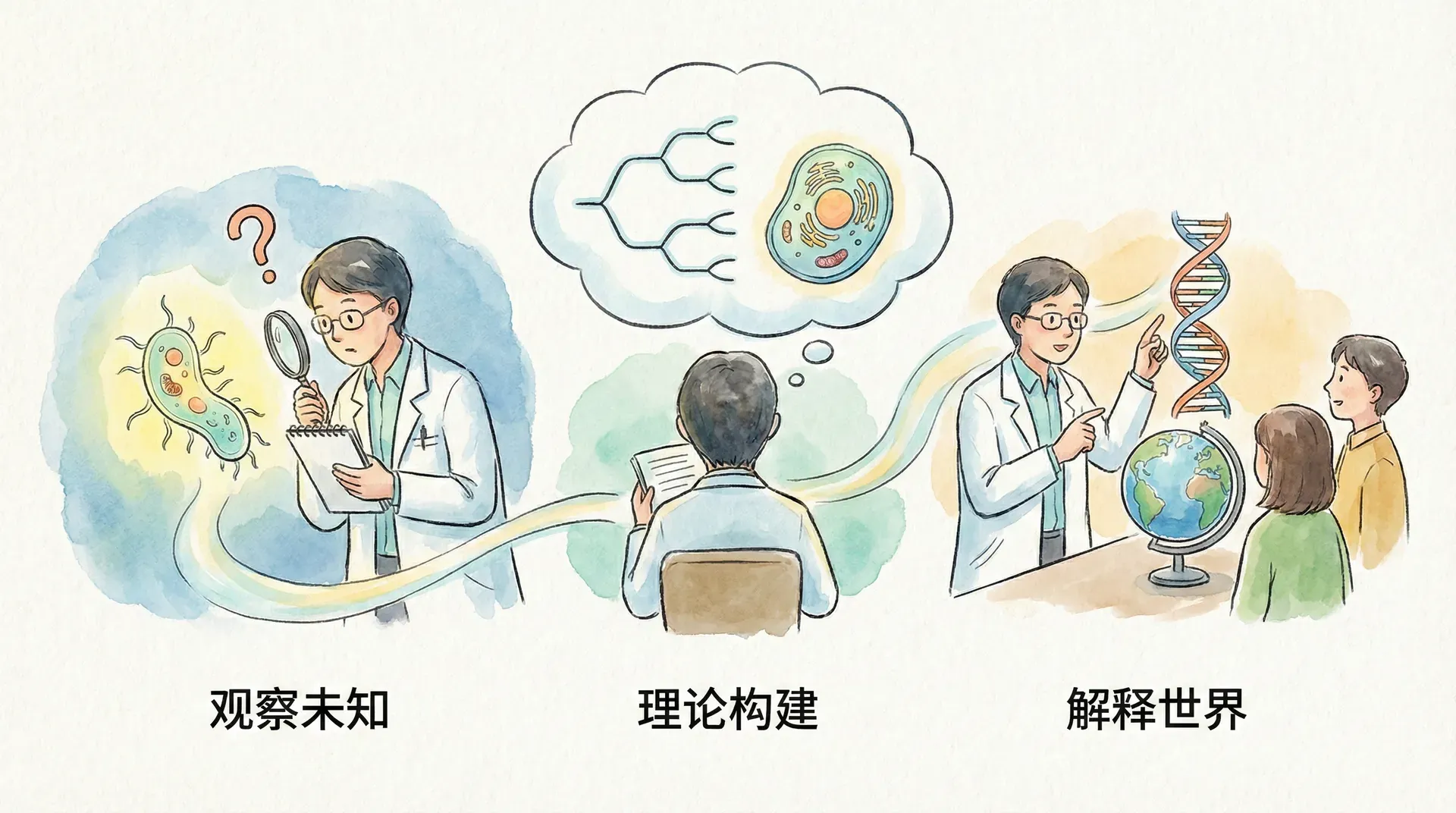 在学习生物学时,我们不仅需要积累和掌握大量具体的知识,更要关注科学研究的思维与方法。科学并非静态的“结论集”,它首先是一种以提问、假设、实证和逻辑推理为内核的探索精神。就像我们可以研究细胞、基因那样,也可以研究科学家是如何发现规律、解释现象、面对挑战与突破认知限制的。这种“关于科学的科学”,常被称为科学哲学、科学史或科学社会学,其本质是帮助我们反思和优化知识产生的路径。