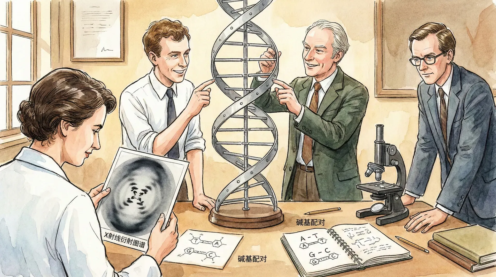 1953年初,沃森与克里克在剑桥大学狭小的实验室内,通过拼搭纸片和铁丝,终于成功建立起“螺旋对螺旋、碱基互补配对”的空间模型。模型显示每一条DNA链以螺旋型缠绕,A与T、G与C严格一一配对,中间由氢键连接,形成稳定且能自我复制的信息结构。1953年4月,二人的论文在《自然》杂志刊出,科学界为之震惊。