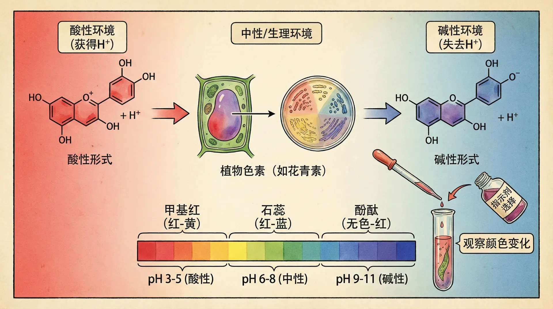 pH指示剂通常为有机弱酸或弱碱分子,其结构中含有可质子化/去质子化的基团。当溶液的pH变化导致这些基团质子化状态改变时,指示剂分子的电子云分布随之变化,吸收光谱也发生变化,从而引发可逆的颜色变化。这一原理使指示剂能在特定pH范围内作为“颜色信号”使用。