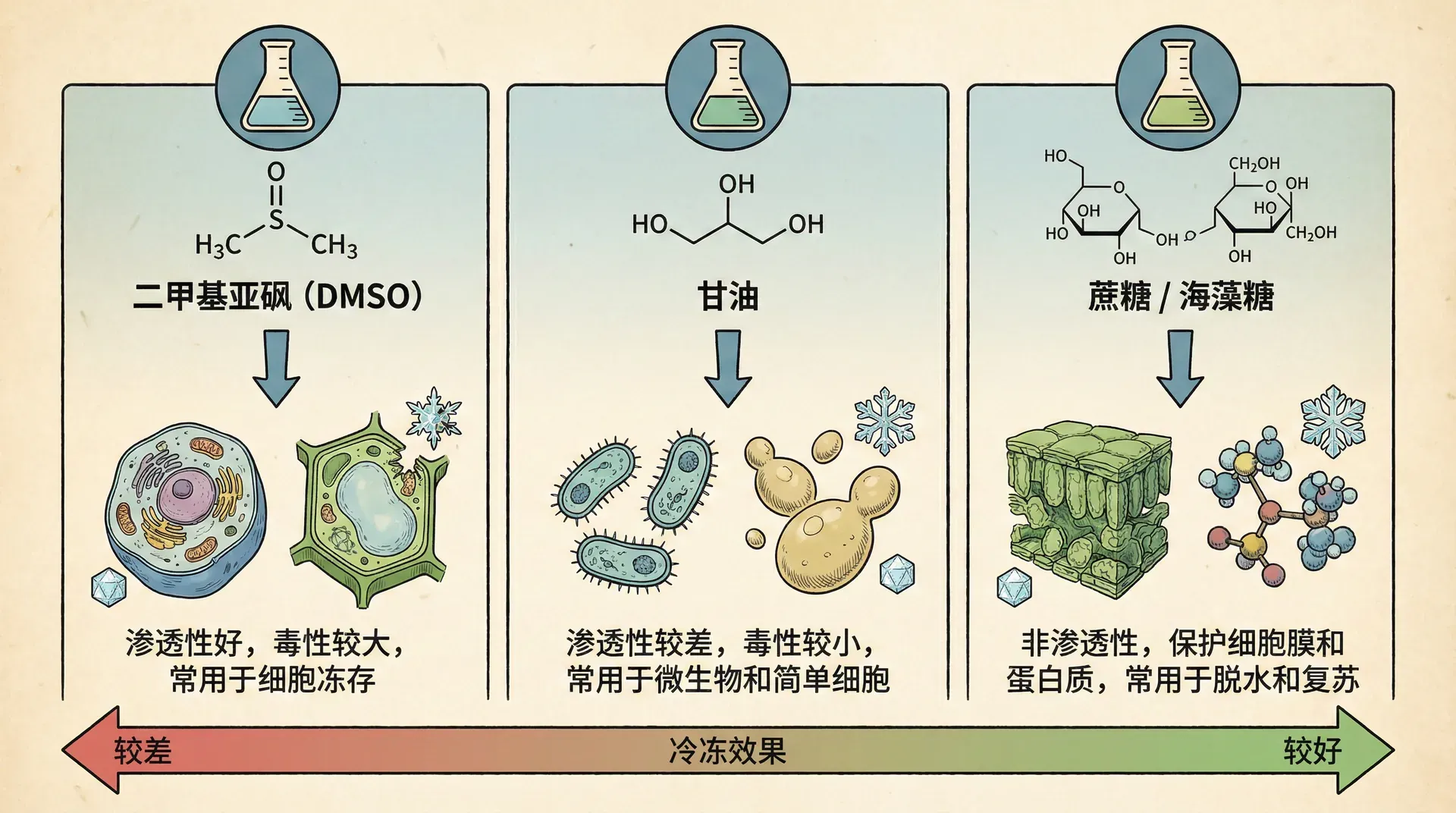 冷冻保护剂的科学选用大大提升蛋白质冷冻保存的成活率。常用冷冻保护剂如下表所示: