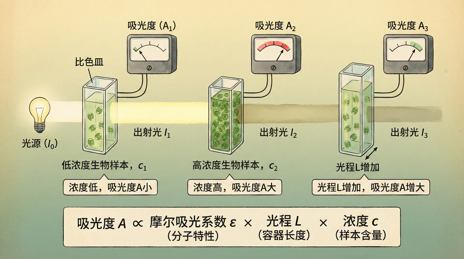 朗伯-比尔定律(Lambert-Beer Law)是分光光度法的核心理论,建立了吸光度、溶质浓度、光程长度之间的定量关系,可表述为: