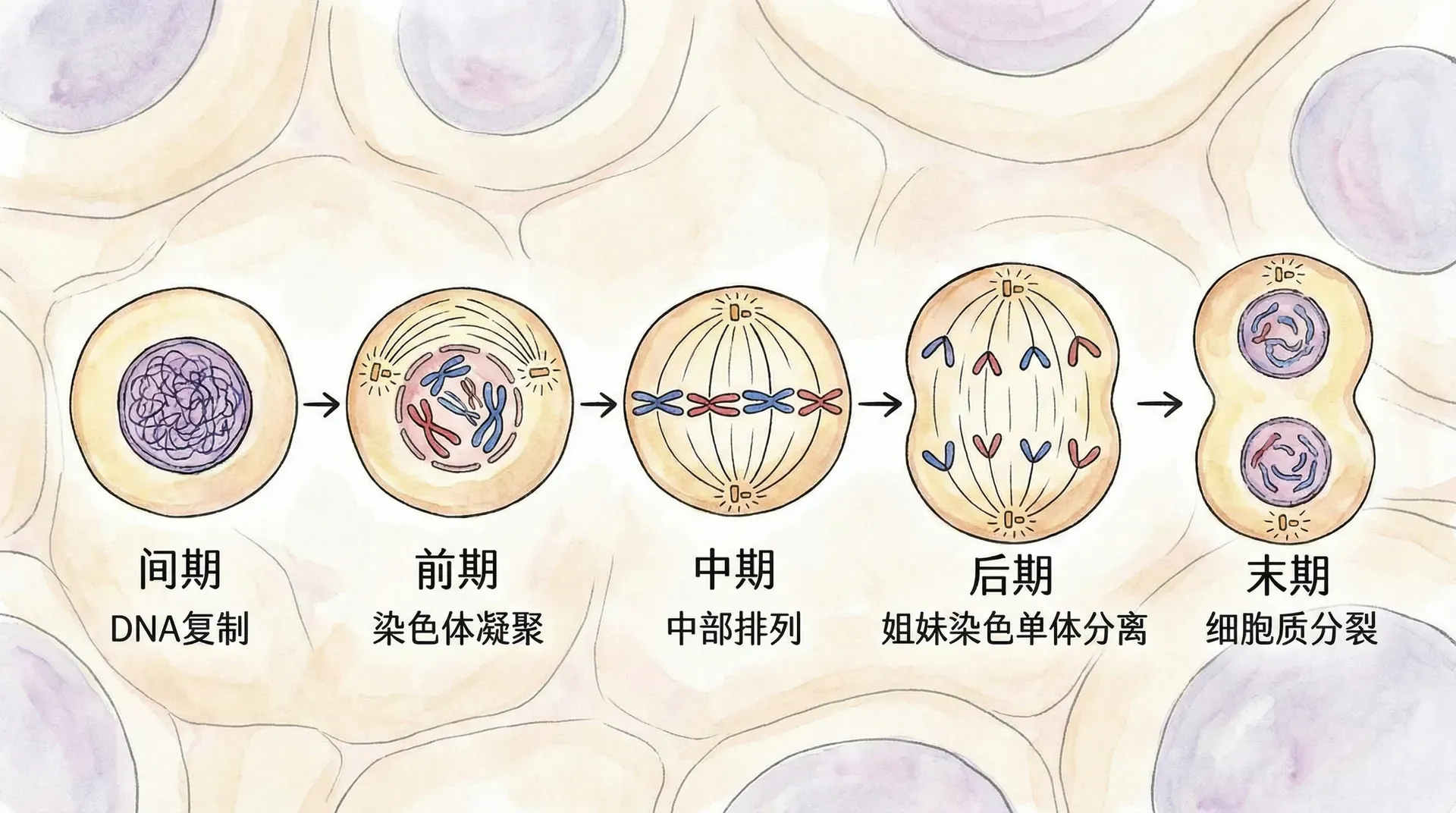 有丝分裂(mitosis)是多细胞有性生物体内最常见的细胞分裂形式。它不仅保证了遗传信息的一致性,也是个体发育、组织修复与生长的基础过程。整个有丝分裂过程十分精细且有序,可以分为五个主要阶段: