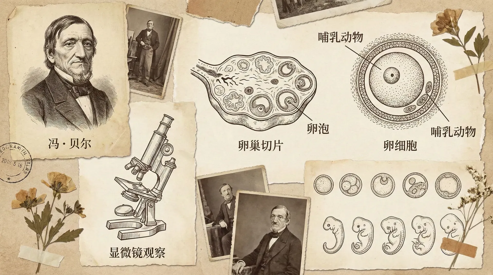 1827年,冯·贝尔做出了他最重要的发现:所有哺乳动物都起源于储存在雌性卵巢中的卵细胞。这个发现看似简单,但在当时却是革命性的。在此之前,人们对生命起源有各种猜测,但没有人能够确切指出哺乳动物的生命从哪里开始。