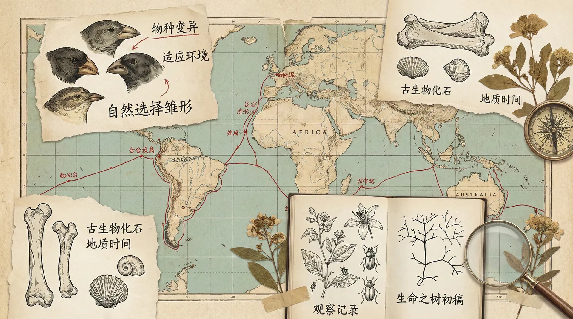 在旅途中,达尔文坚持做详细笔记,采集大量动植物和化石标本。他阅读查尔斯·莱尔的地质学著作,被“地球缓慢演变”思想深深影响,即地球的面貌源于持续的微小变化而非灾难性突变。