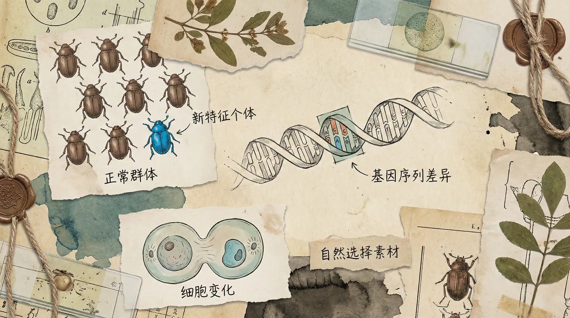 德弗里斯基于对月见草等实验观察,归纳出:有些变异可突然出现,且能世代遗传,成为繁殖后代的新优势。现代分子生物学发展后,突变本质被揭示为DNA结构序列的改变(即“变异”)。