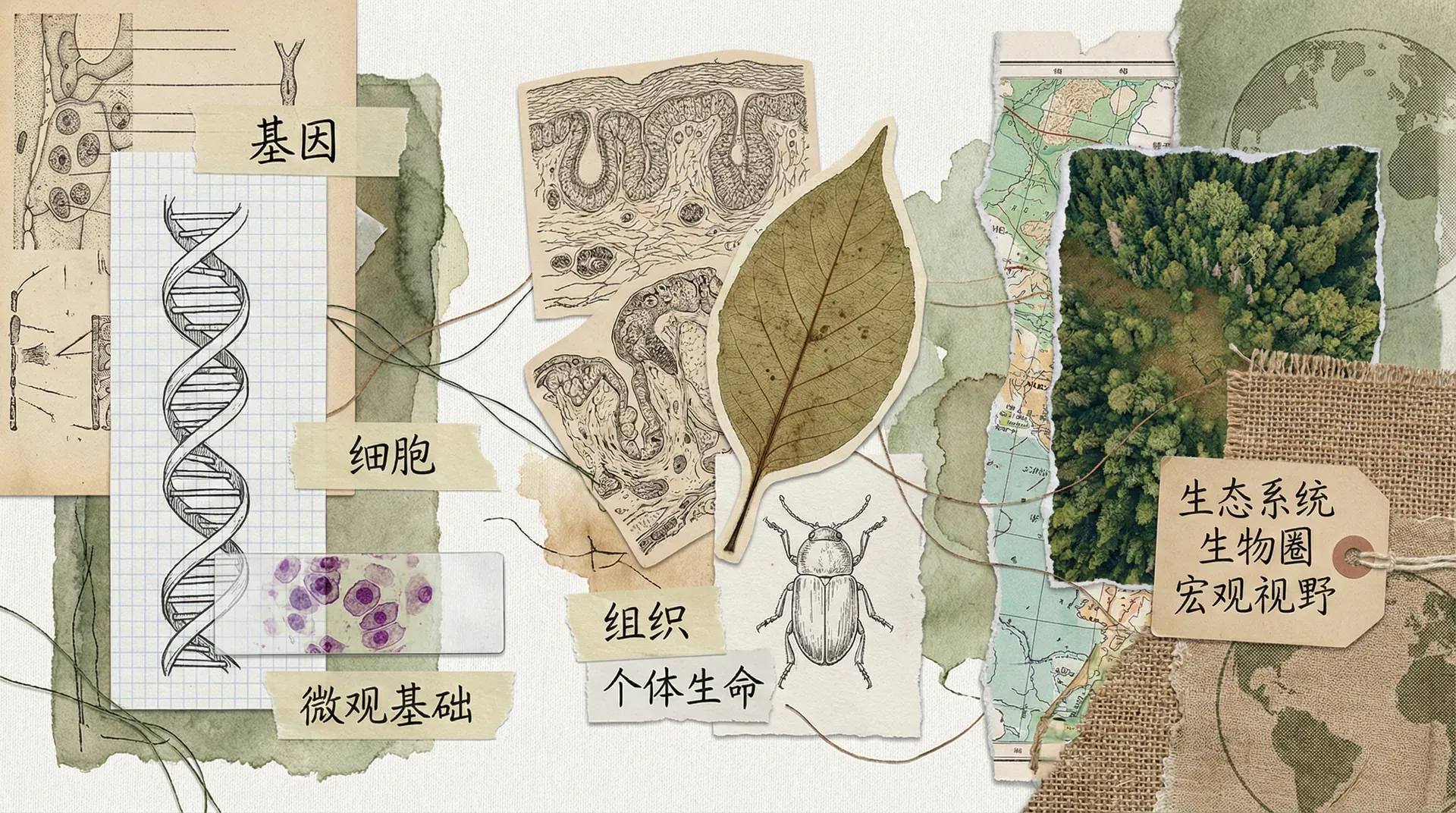 再把视野拓展到更大的层次,一个生物体并不是孤立存在的:同种生物可以组成种群,不同种生物与环境组成生态系统。无数个体、种群、生态系统环环相扣,铸就了地球上丰富多彩的生命大观。这种从细胞、个体到种群、再到生态圈的层层结构,是理解生命科学的“微观—宏观”基本脉络。