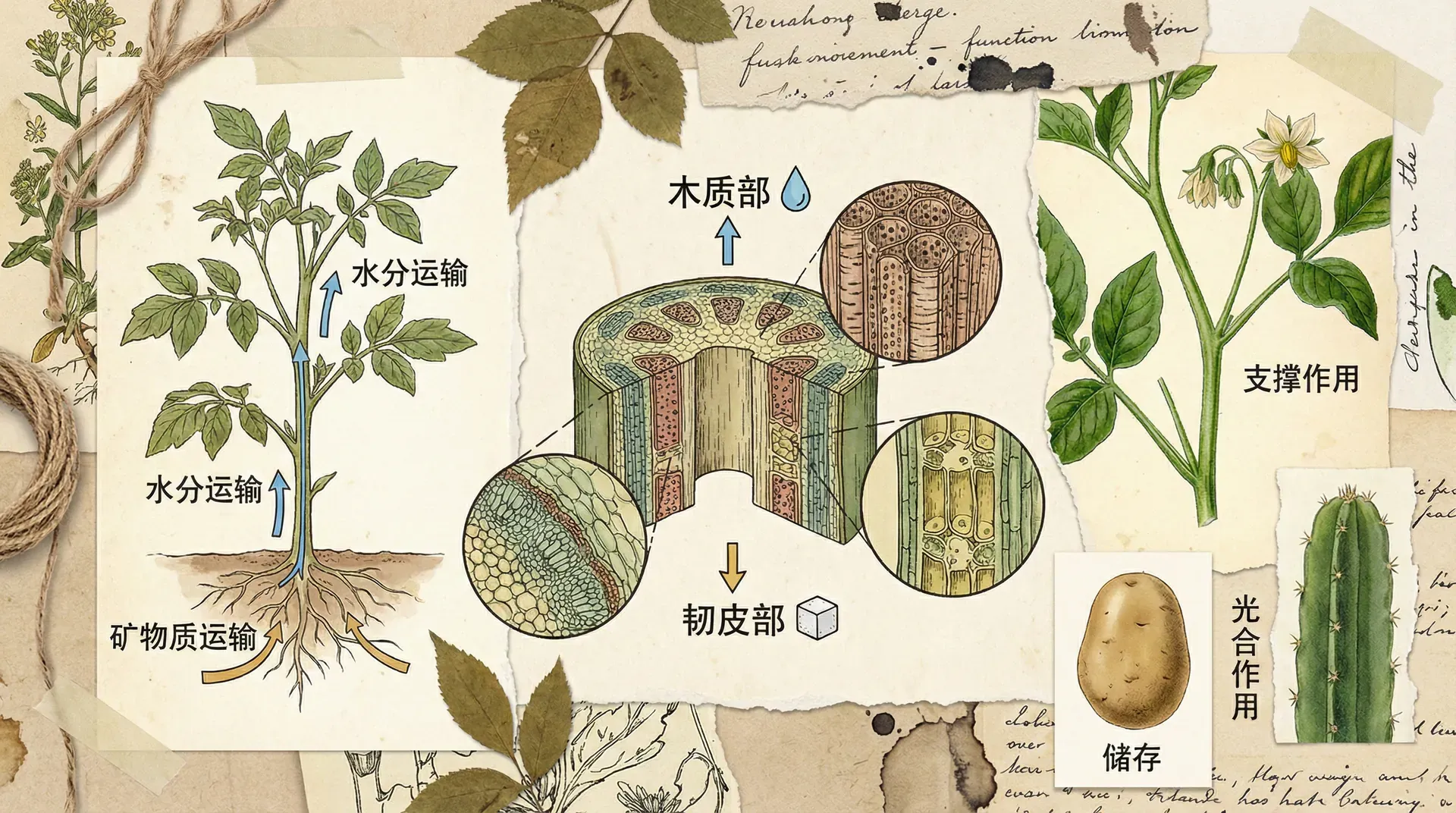 有趣的是,一些作物(如马铃薯)的茎还能膨大,成为“块茎”,其中储存大量淀粉,用于植物过冬和作为人类的主要粮食来源。