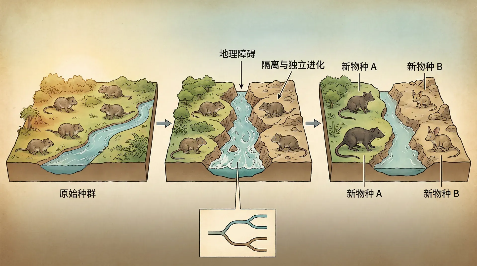 原本连续分布的物种被这个不断升高的山脉分隔在南北两侧。南侧保持了温暖湿润的气候,而北侧则逐渐变得干旱寒冷。在这两种截然不同的环境中,原本同一物种的南北种群各自适应当地环境,逐渐累积差异,最终形成了不同的物种。今天,我们可以在喜马拉雅山脉南北两侧找到许多这样的姐妹物种,它们形态相似但已经不能杂交。