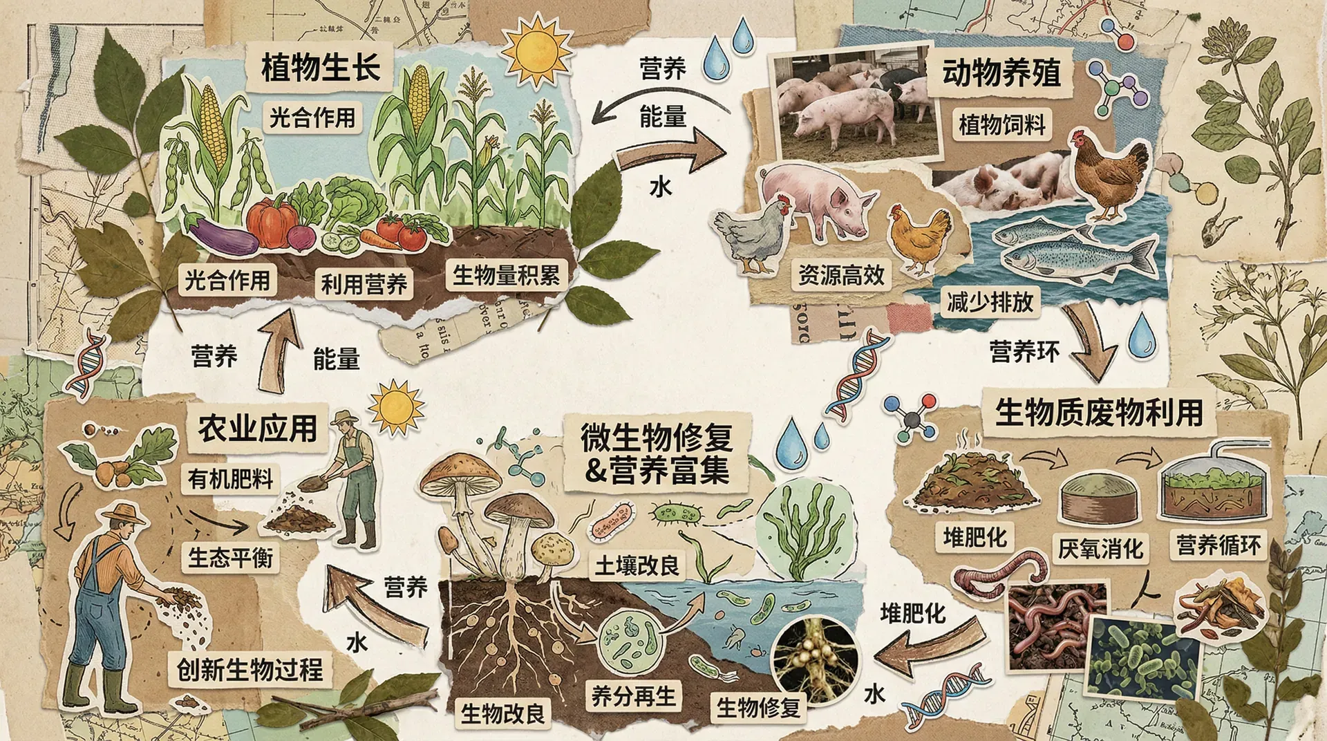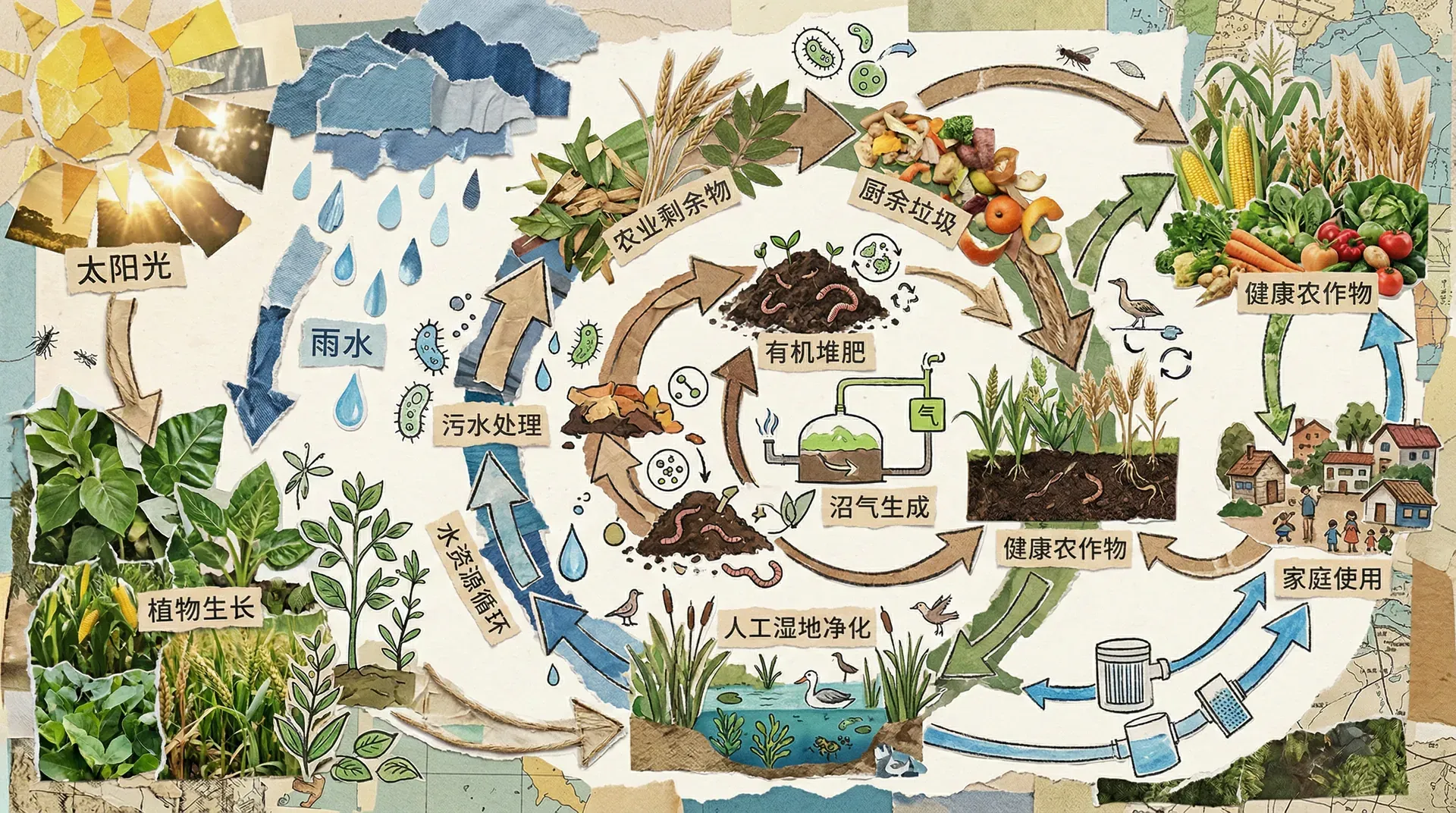 自然界中的物质是循环往复的,没有真正的废物,一种生物的排泄物往往是另一种生物的营养源。在第十章中我们学习过碳循环和氮循环,这些物质循环的过程为生态工程提供了重要的理论基础。生态工程正是利用这一原理,将生产过程中产生的废弃物转化为有用资源,形成一个完整的物质循环链条。