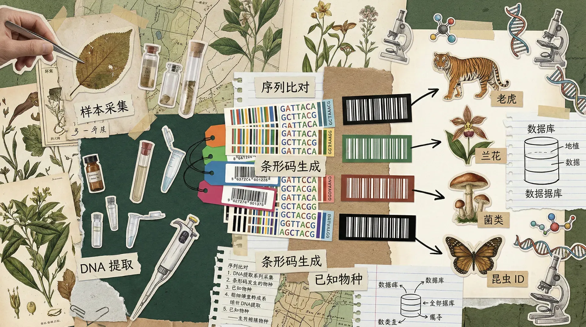 DNA条形码是利用生物体基因组中特定片段(动物常用COI基因,植物常用rbcL和matK等)进行快速物种鉴定的方法。其优势在于: