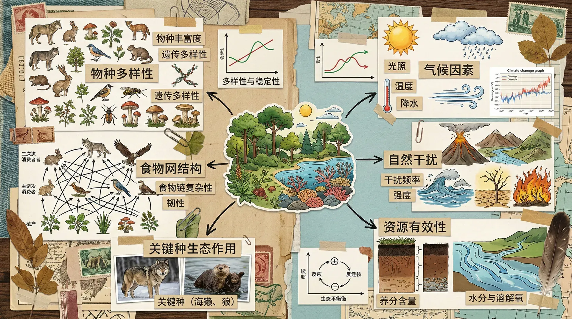 生态系统的稳定性受多种因素影响,核心主要为系统的组分多样性和营养结构复杂程度。