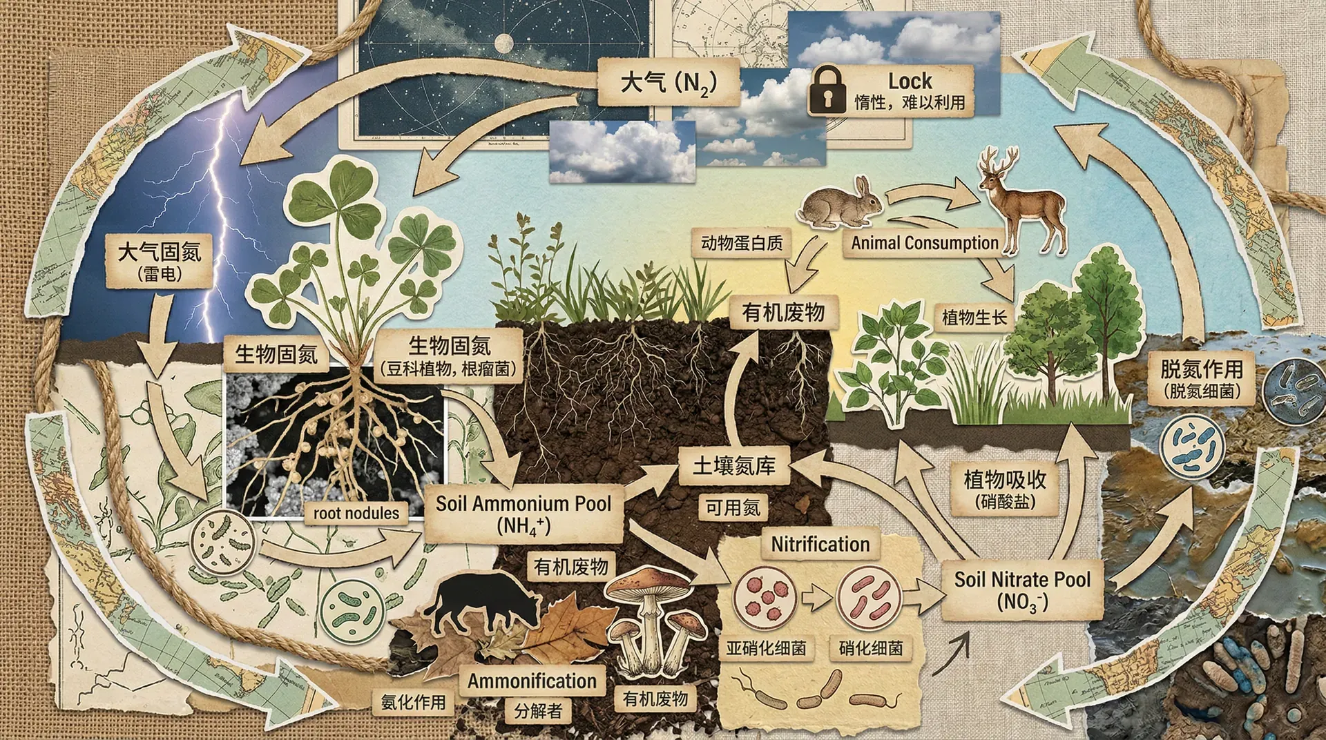 氮是组成蛋白质和核酸的重要元素,对生物的生长发育至关重要。尽管大气中氮气的含量高达78%,但大多数生物无法直接利用气态氮,必须通过特殊的途径才能将氮元素纳入生物循环。